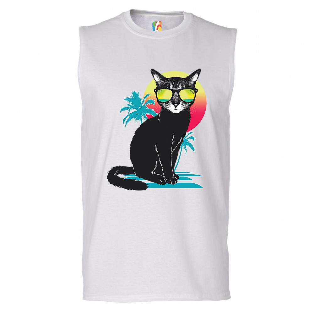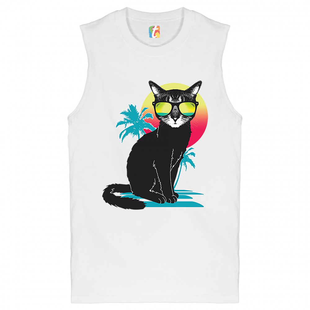 COOL SUMMER CAT muscle shirt neon kitty on a beach animal lovers men's white