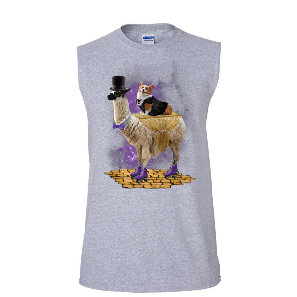 CORGI RIDING A LLAMA corgi riding a gentleman llama muscle shirt funny weird universe dog sleeveless gray