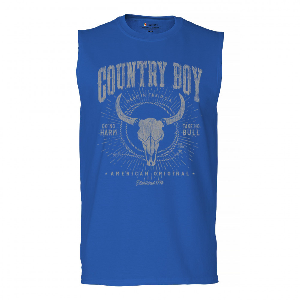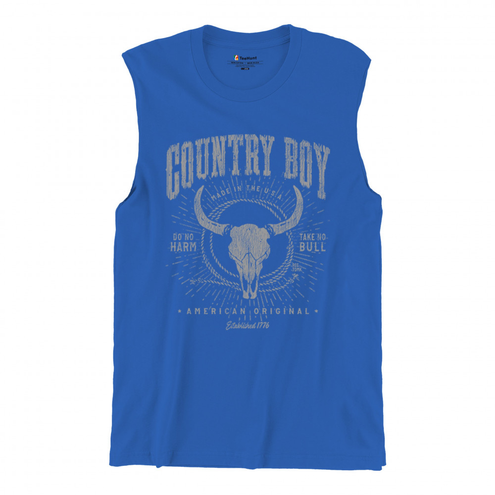 Bold country boy design with bull skull, distressed western style, patriotic grit, and the phrase “Do No Harm, Take No Bull.â€