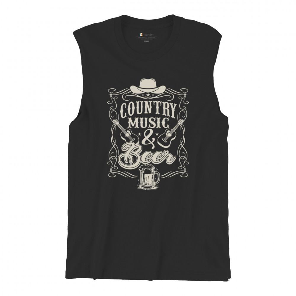 Country music and beer unite in this rustic design with cowboy hat, guitars, and scrollwork. Great for rodeos, festivals, and southern pride.