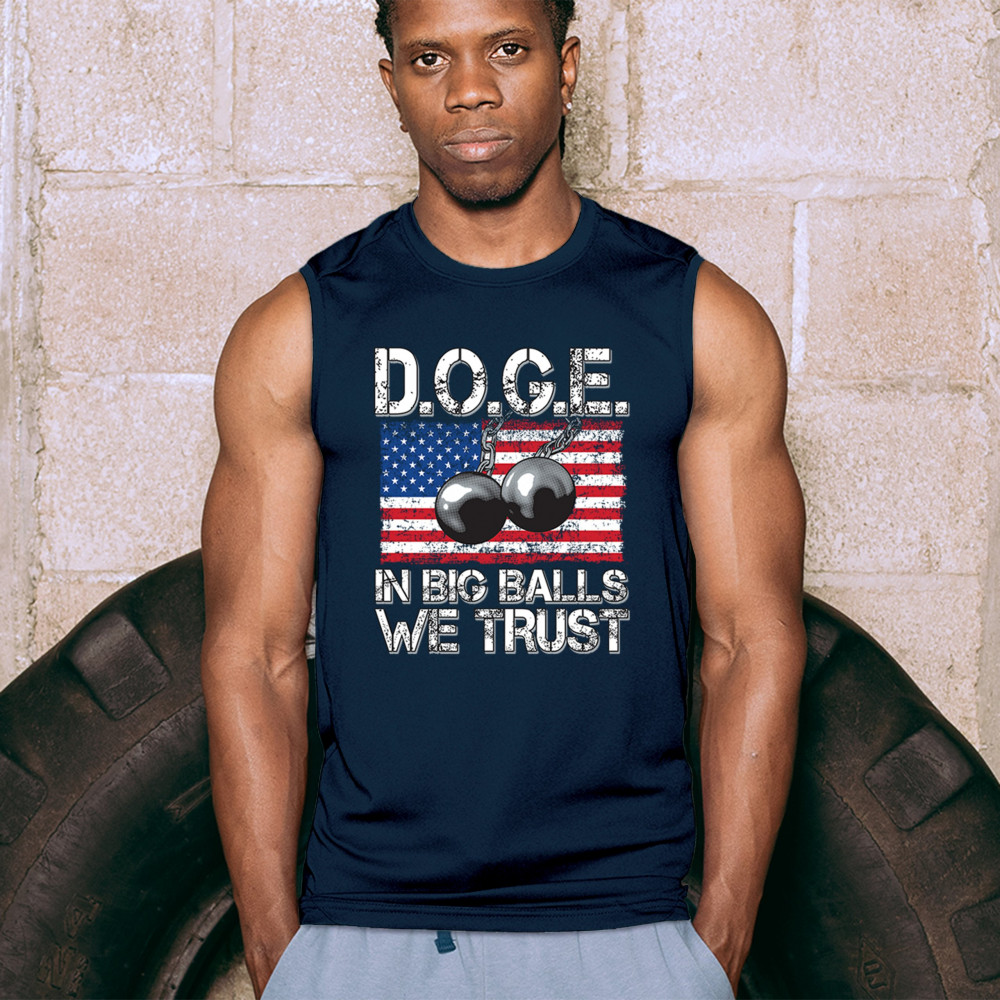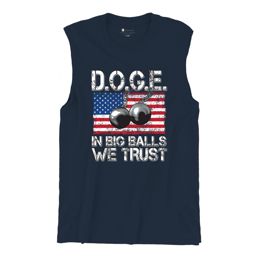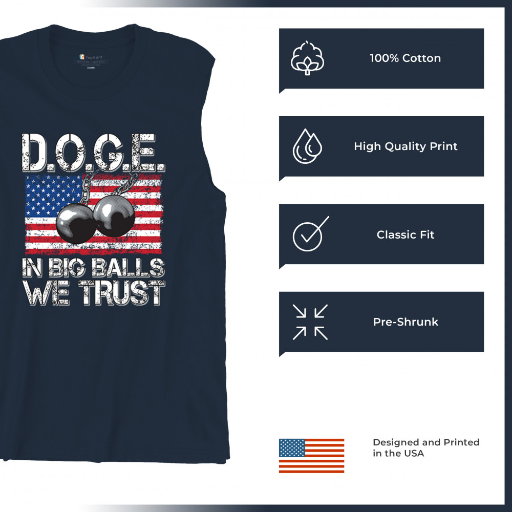 The D.O.G.E. In Big Balls We Trust design blends patriotic grit with sharp political satire. Featuring chained wrecking balls over a distressed American flag, this graphic hits hard. Perfect for conservative men, bold personalities, and political events like rallies, debates, and meetups.