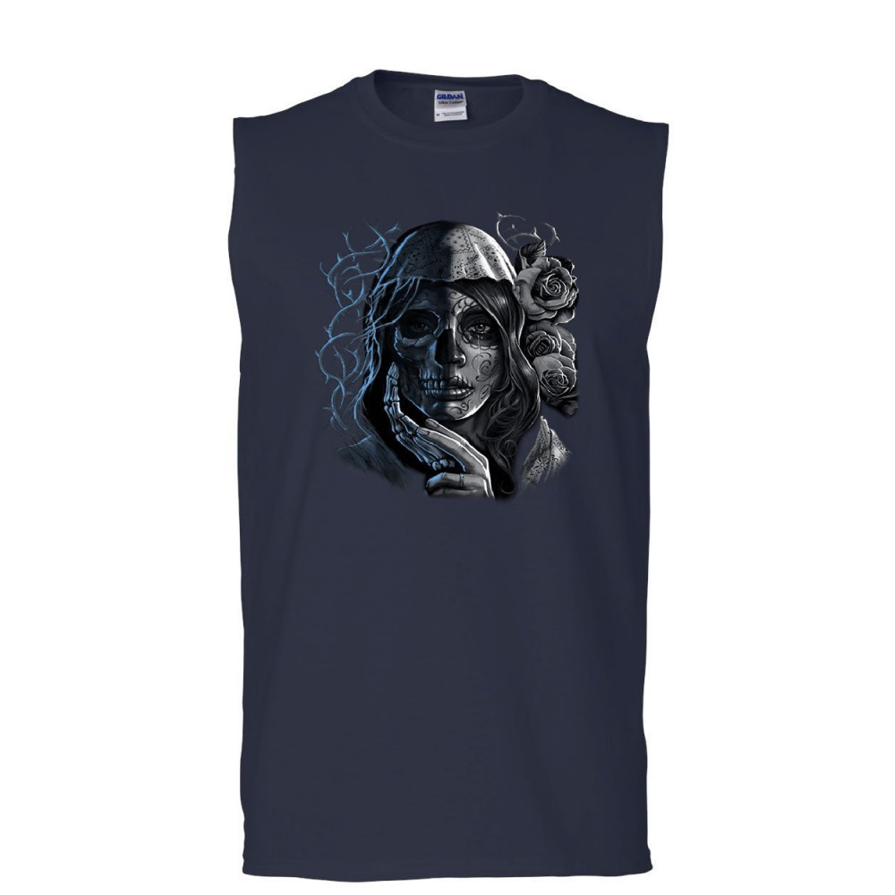 DEAD GIRL WITH ROSES muscle shirt sugar skull face day of the dead sleeveless navy blue