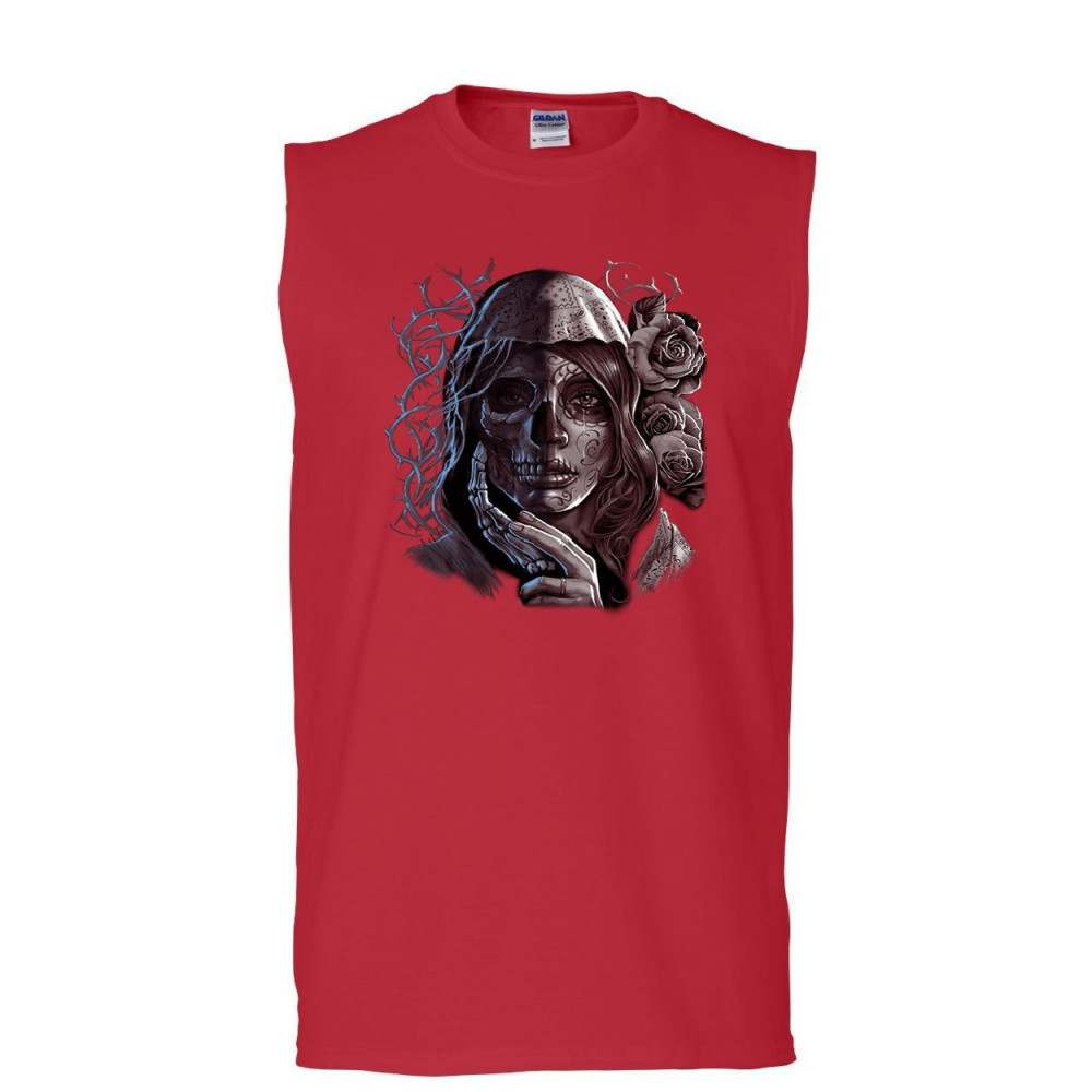 DEAD GIRL WITH ROSES muscle shirt sugar skull face day of the dead sleeveless red