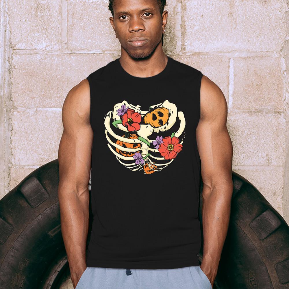 Celebrate Halloween with a quirky and cute design featuring a skeleton ribcage filled with pumpkins and flowers. Perfect for spooky season lovers!