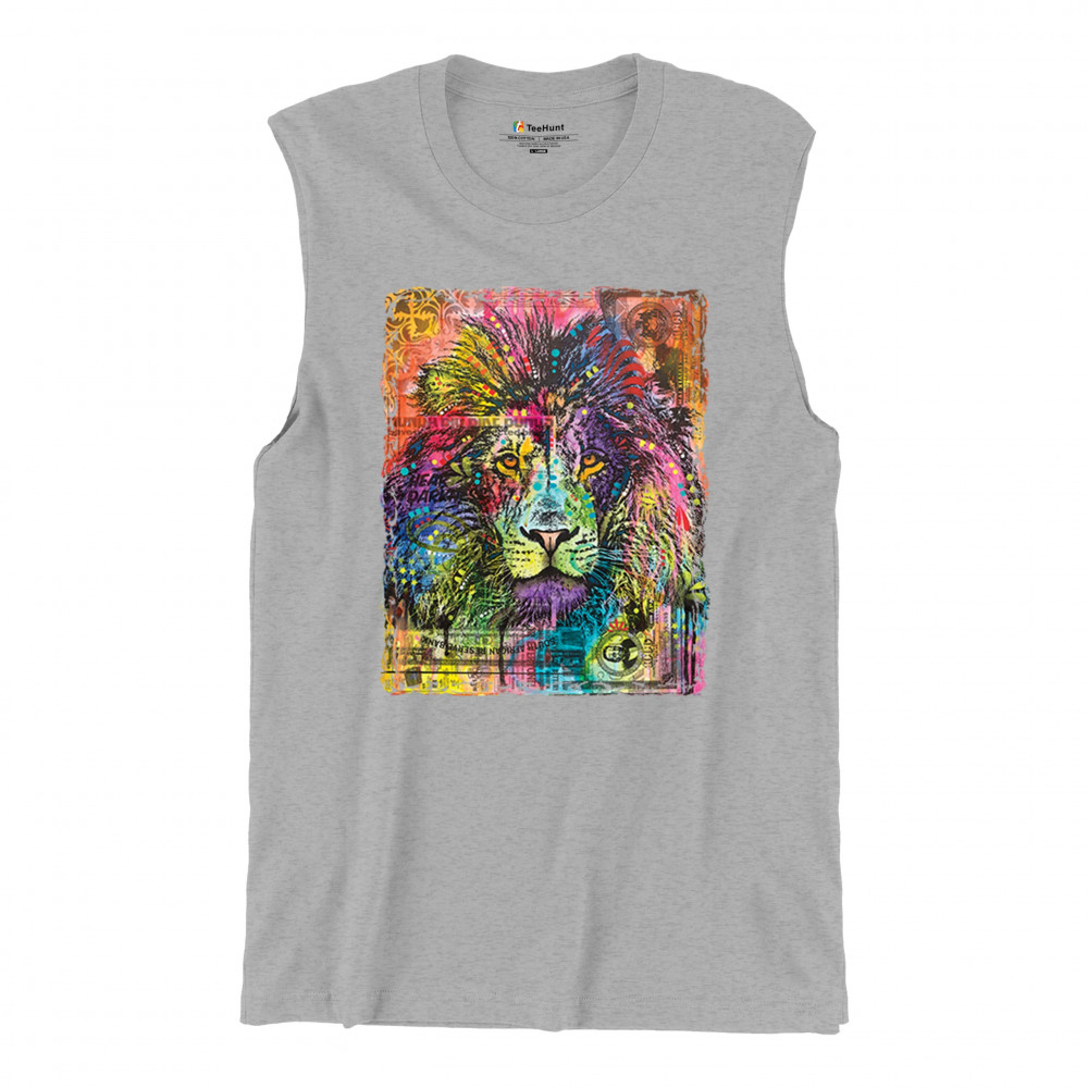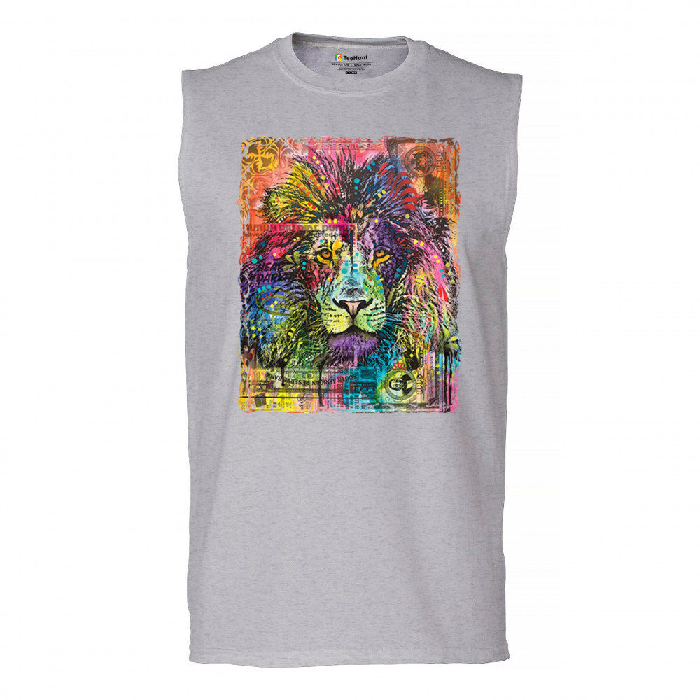 DEAN RUSSO COLORFUL LION HEAD muscle shirt wild life king roar big cat men's gray