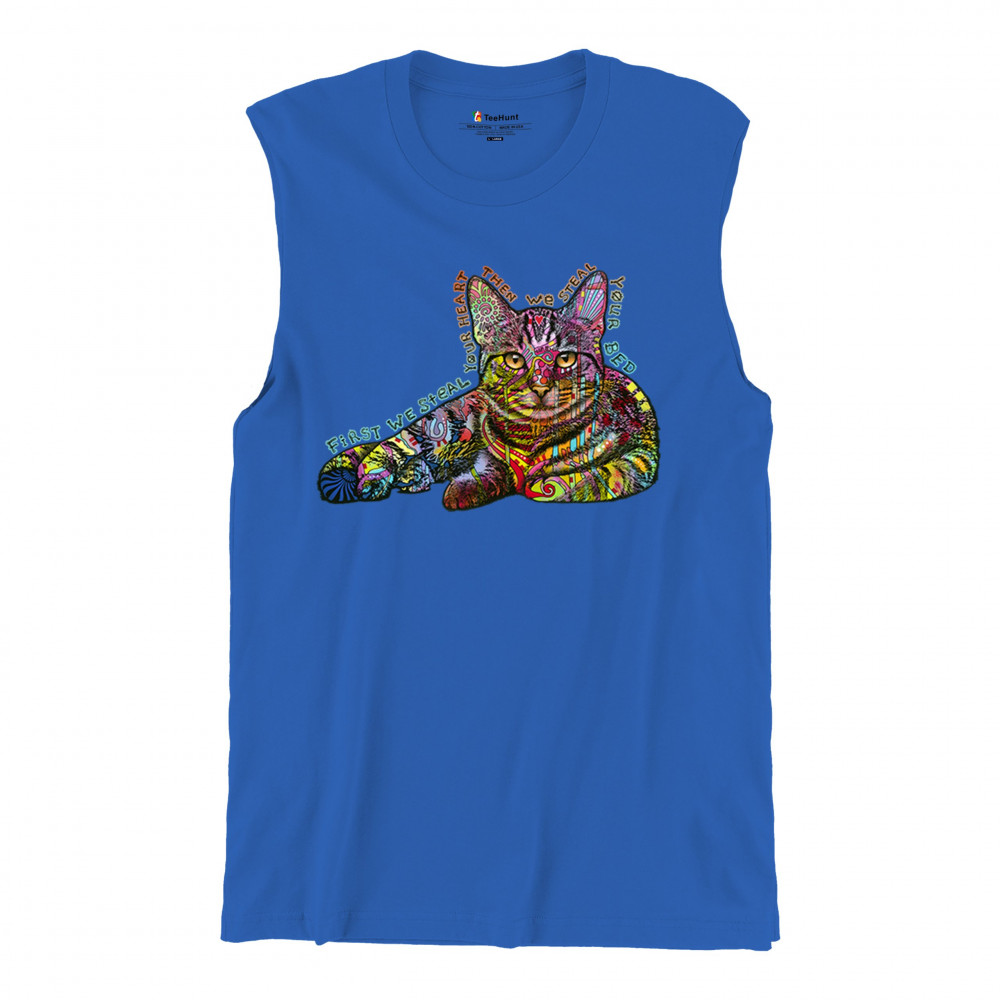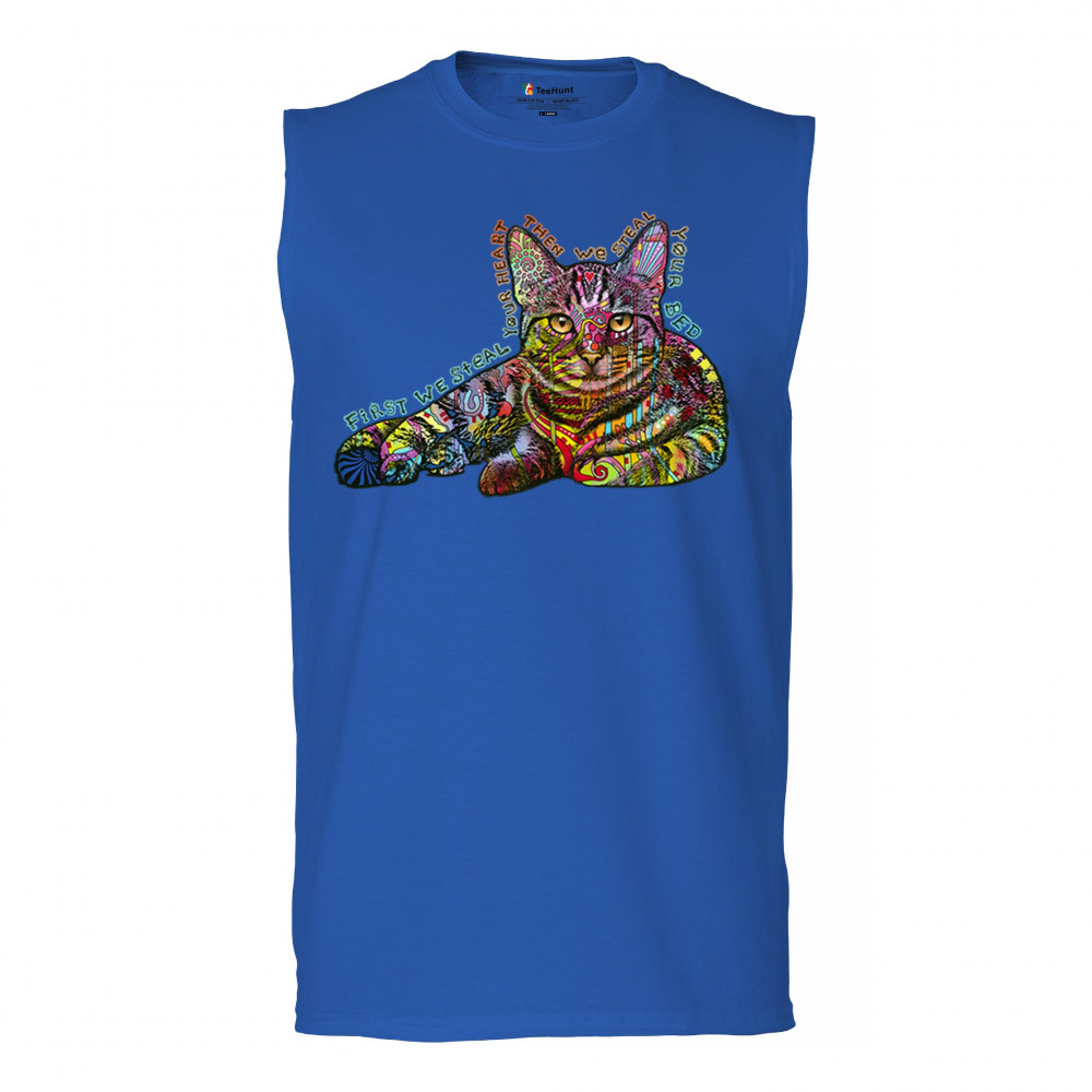 DEAN RUSSO CUTE NEON CAT muscle shirt first we steal your heart kitten men's royal blue