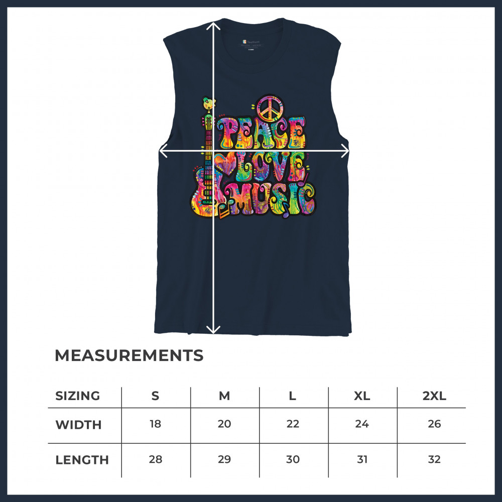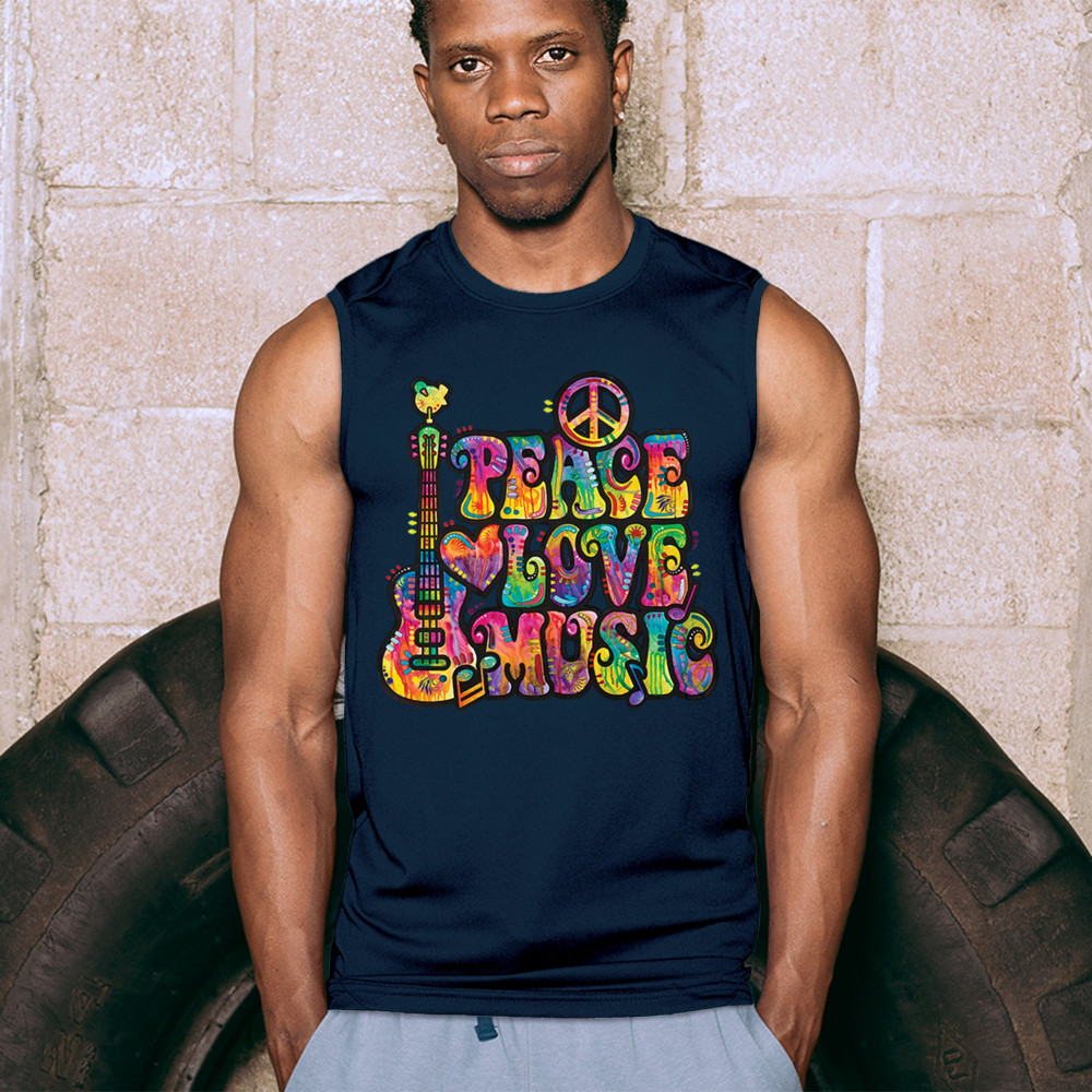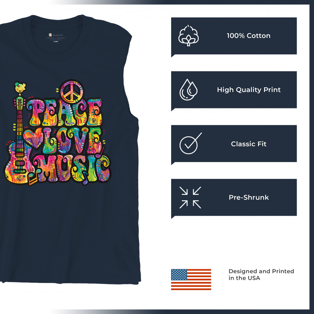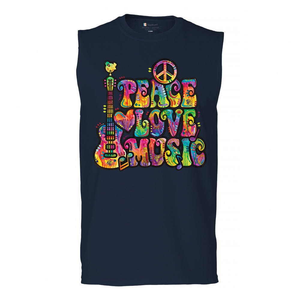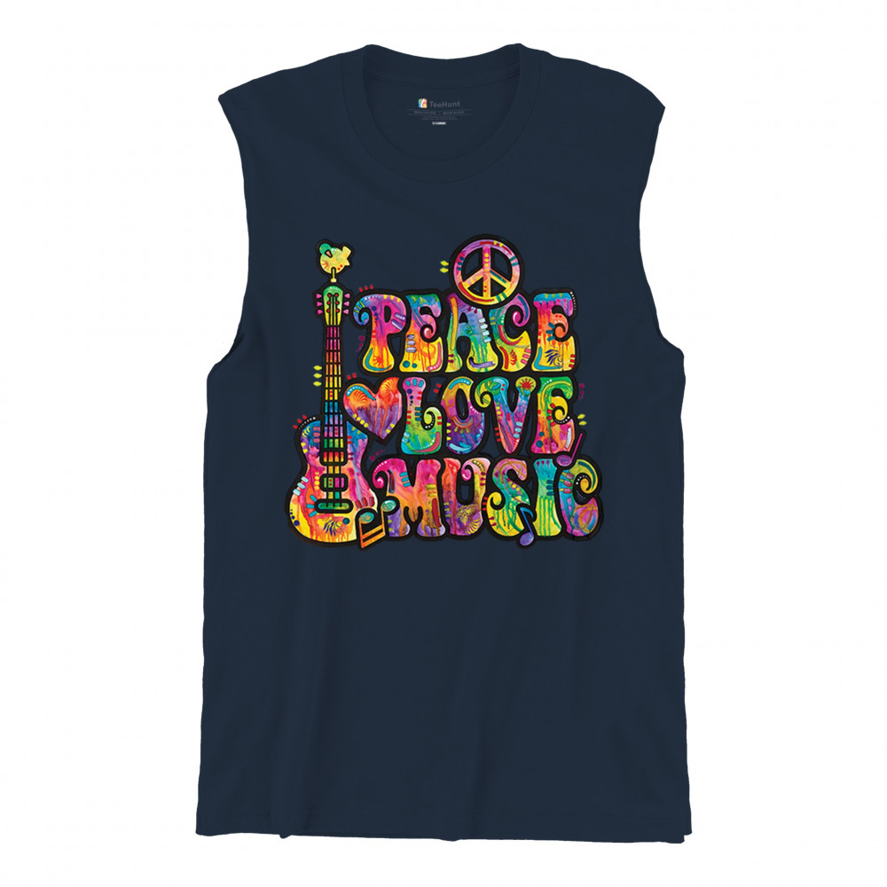 DEAN RUSSO PEACE LOVE MUSIC muscle shirt guitar happy good vibe men's navy blue
