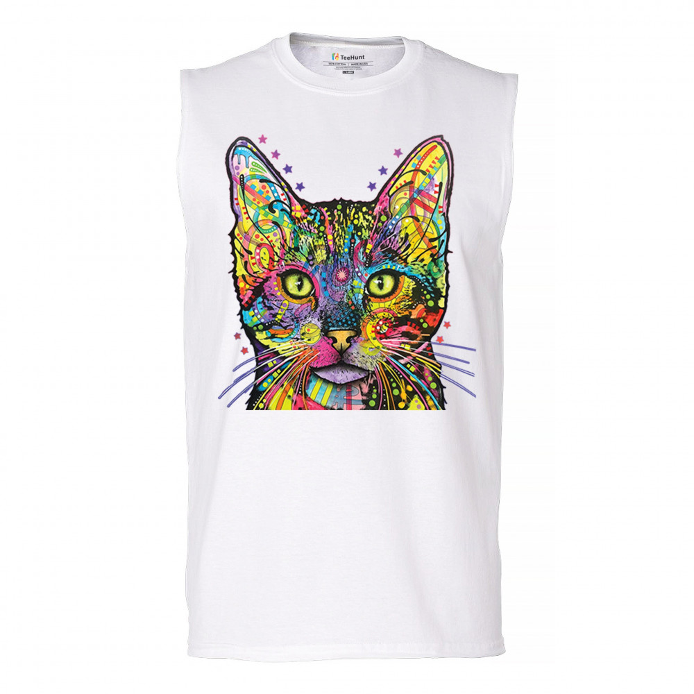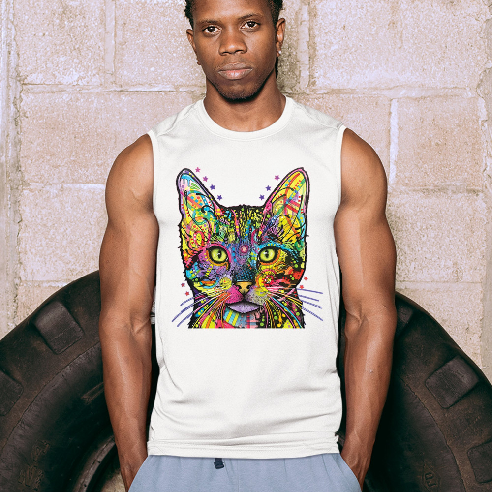 DEAN RUSSO SHIVA CAT STARE muscle shirt neon mosaic colorful kitten eyes men's white
