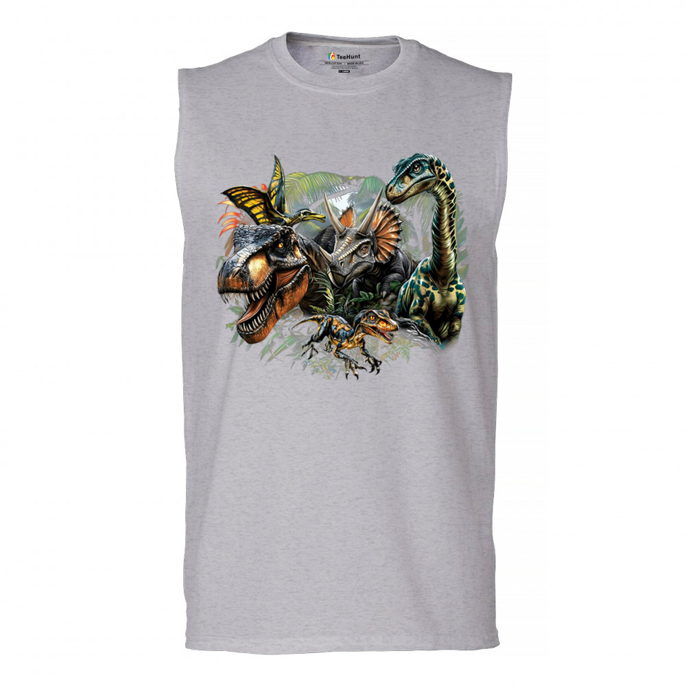 Bold jungle dinosaur design featuring t rex, triceratops, raptor, brachiosaurus, and pteranodon. Perfect for parties, digs, and dino fans.