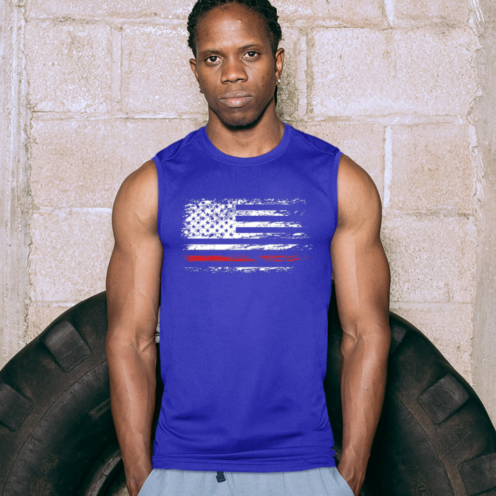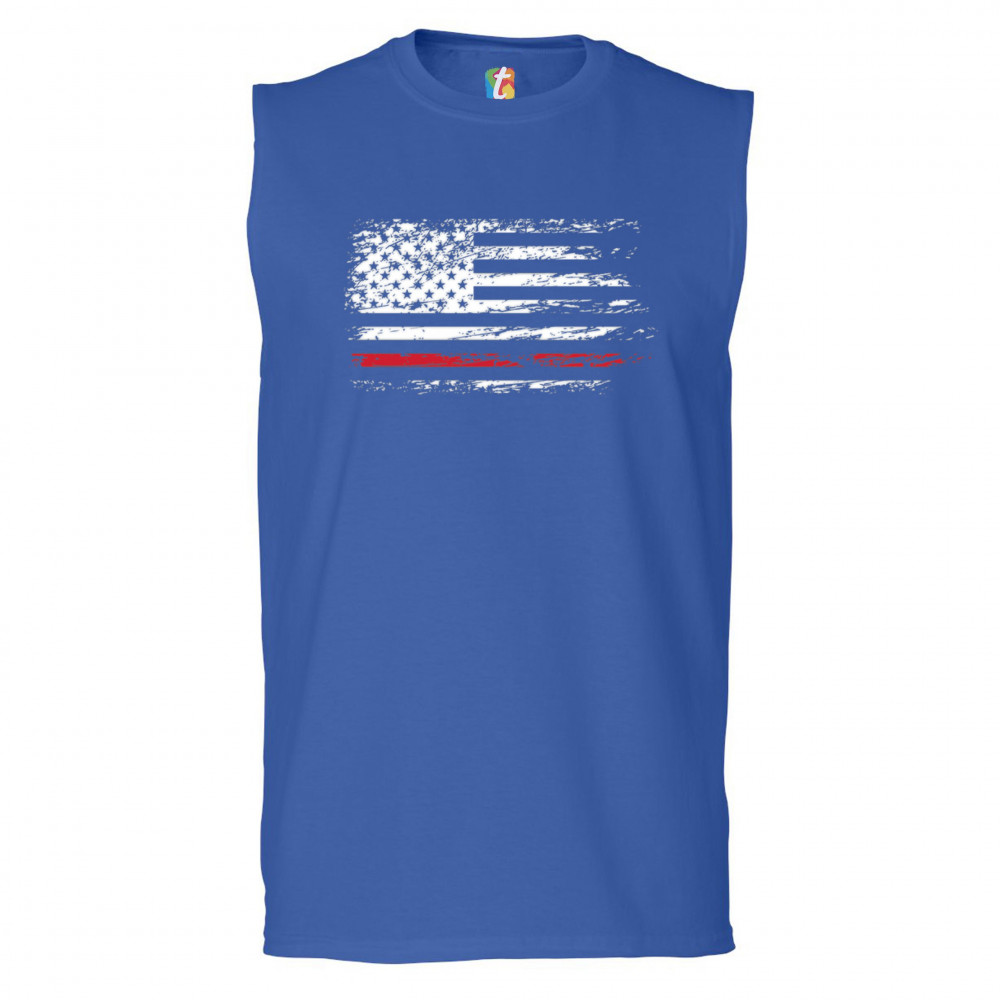 DISTRESSED AMERICAN FLAG muscle shirt thind red line firefighter men's royal blue