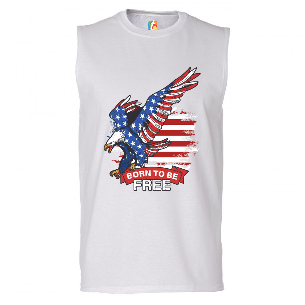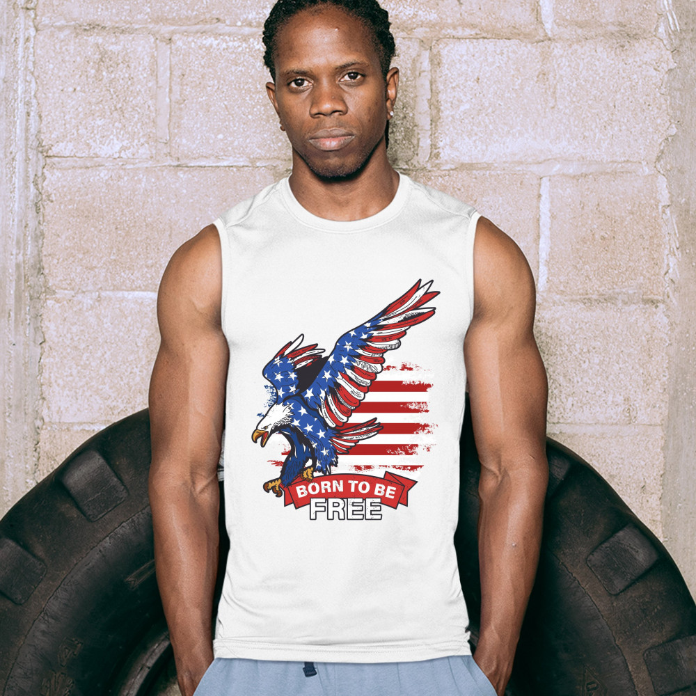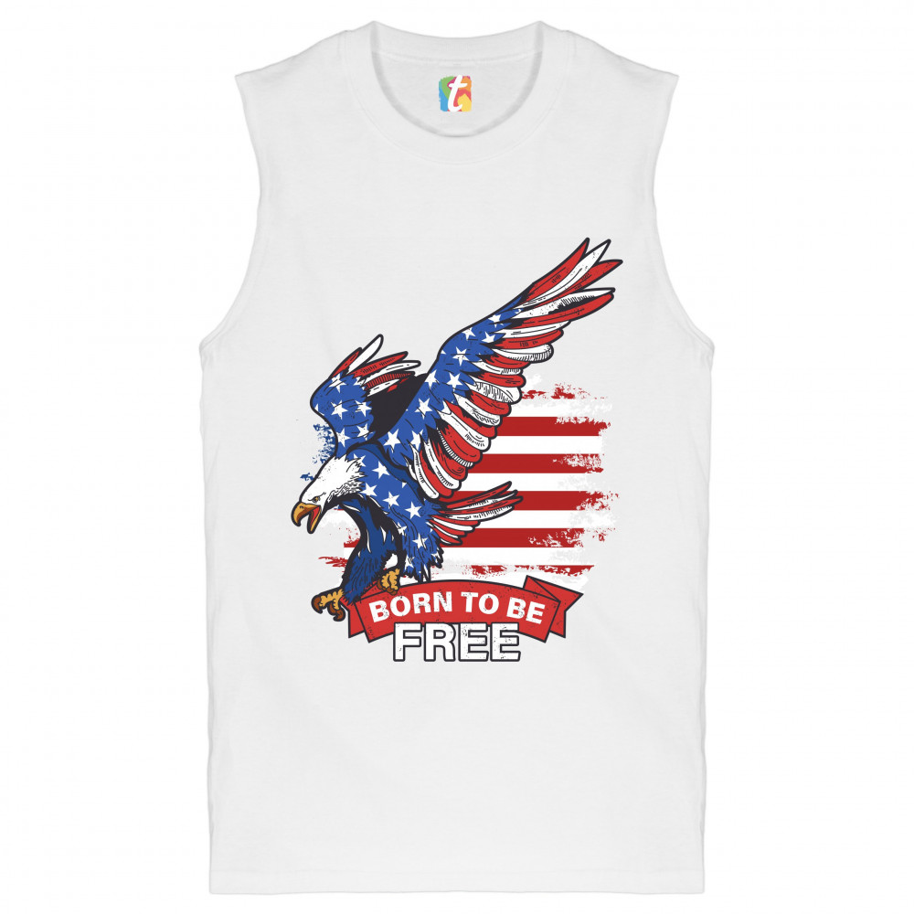 A patriotic print saying "Born to Be Free" and featuring a diving American Bald Eagle. In the background there is a distressed American Flag and the eagle is covered with Stars and Stripes. Great choice to wear on Independence Day or any other patriotic h