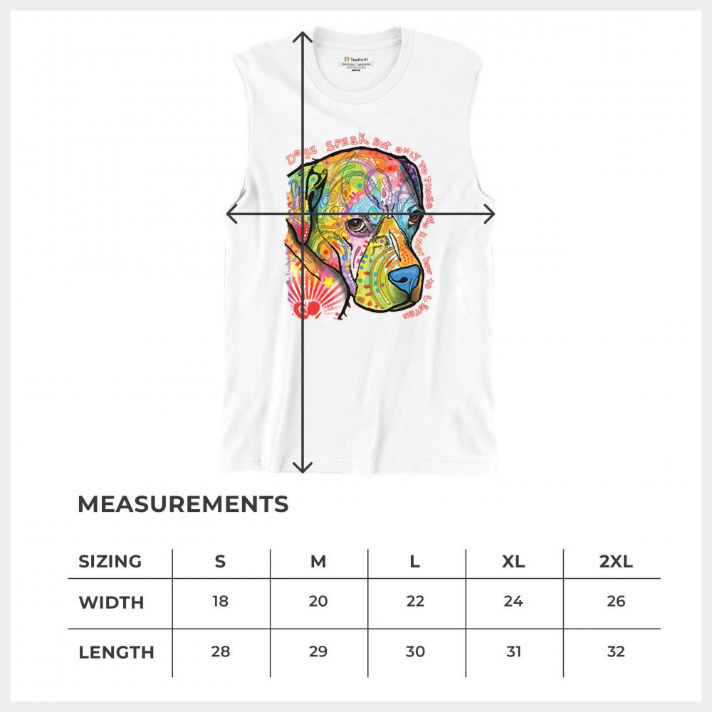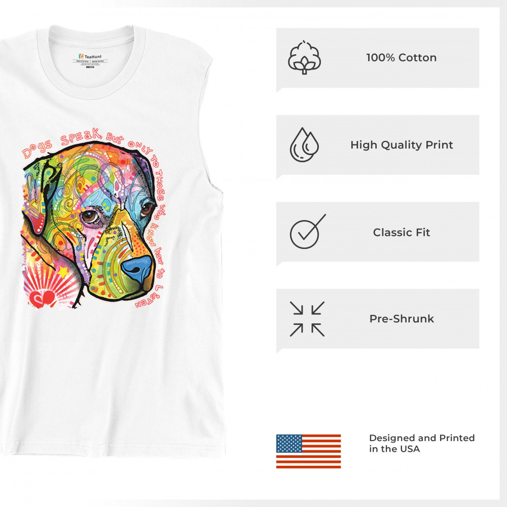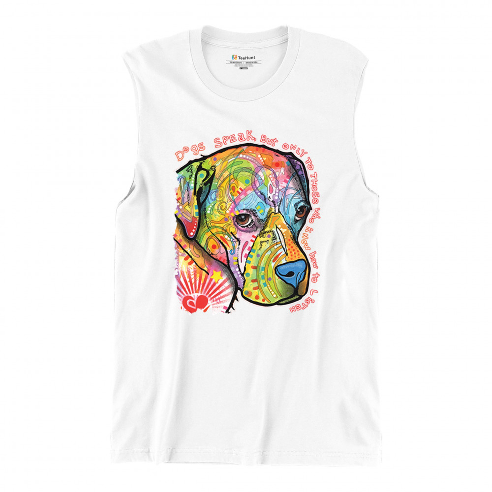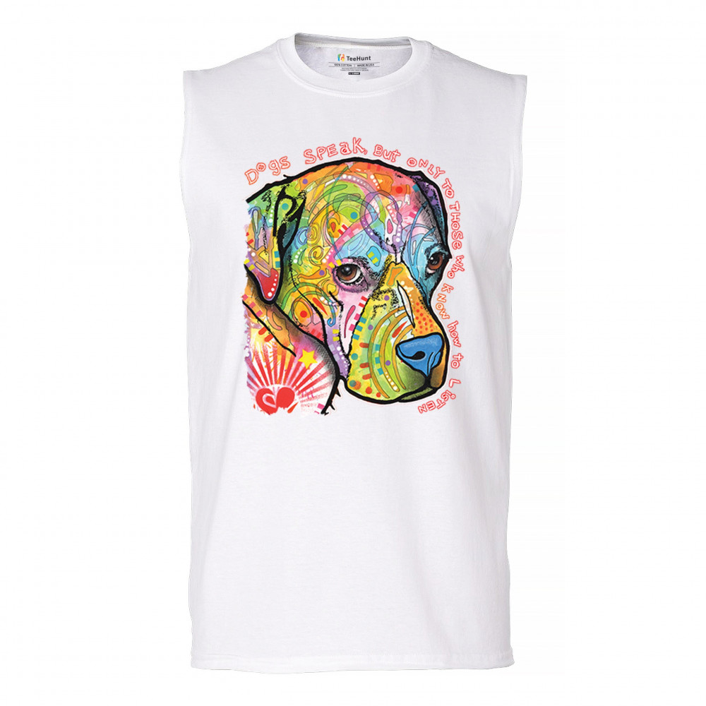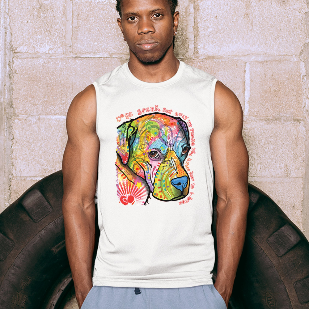DOGS SPEAK TO THOSE WHO LISTEN muscle shirt dean russo neon pet puppy men's white