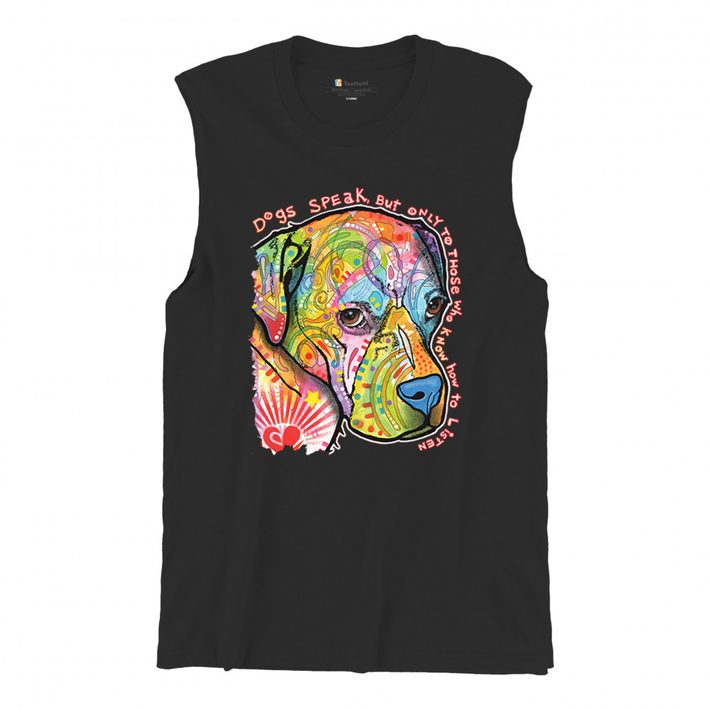 DOGS SPEAK TO THOSE WHO LISTEN muscle shirt dean russo neon pet puppy men's black