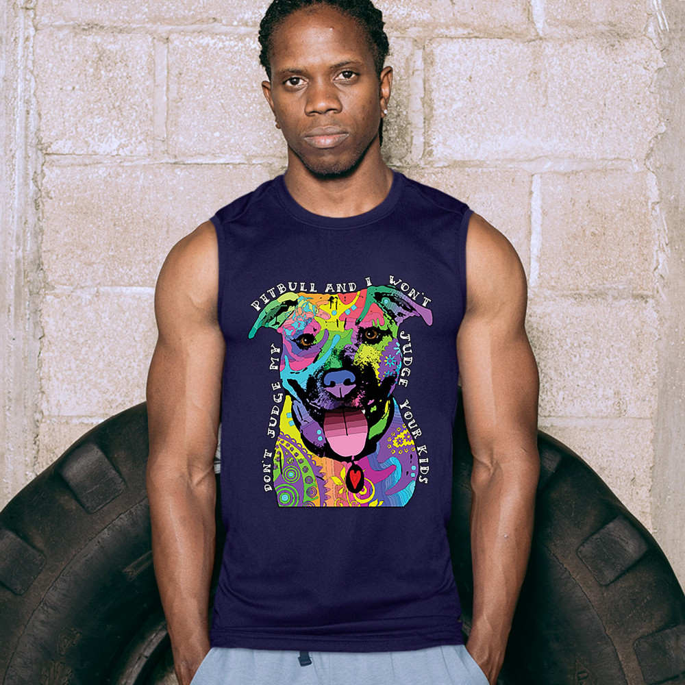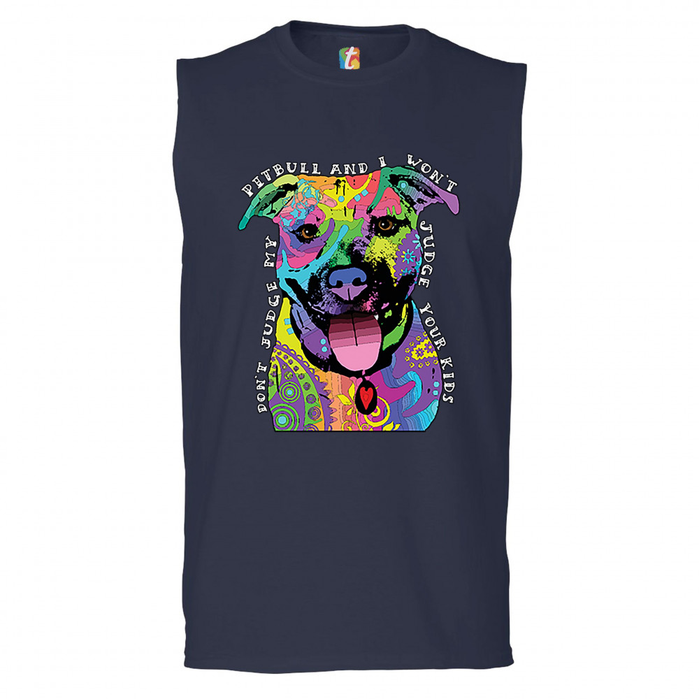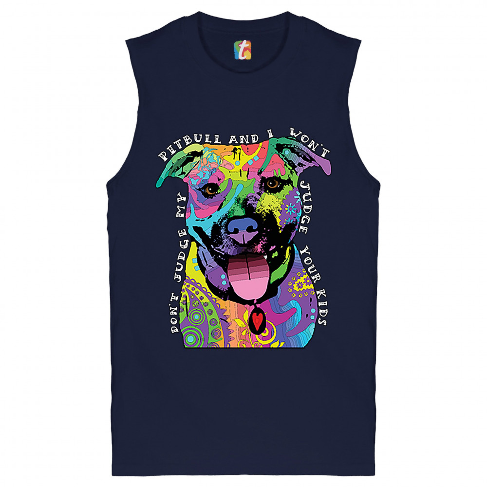 DON'T JUDGE MY PIT BULL muscle shirt funny andy maxx dog lover pet owner men's navy blue