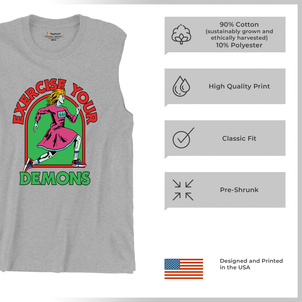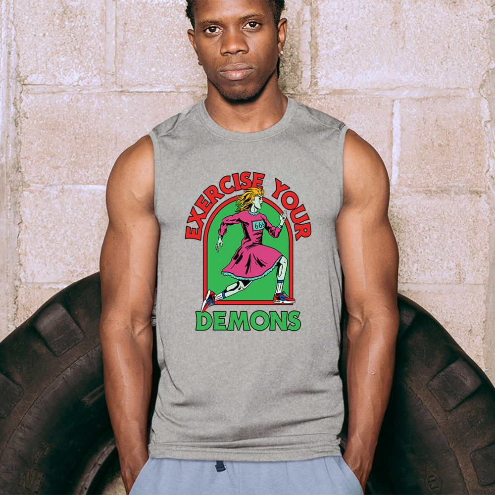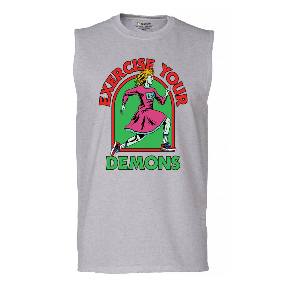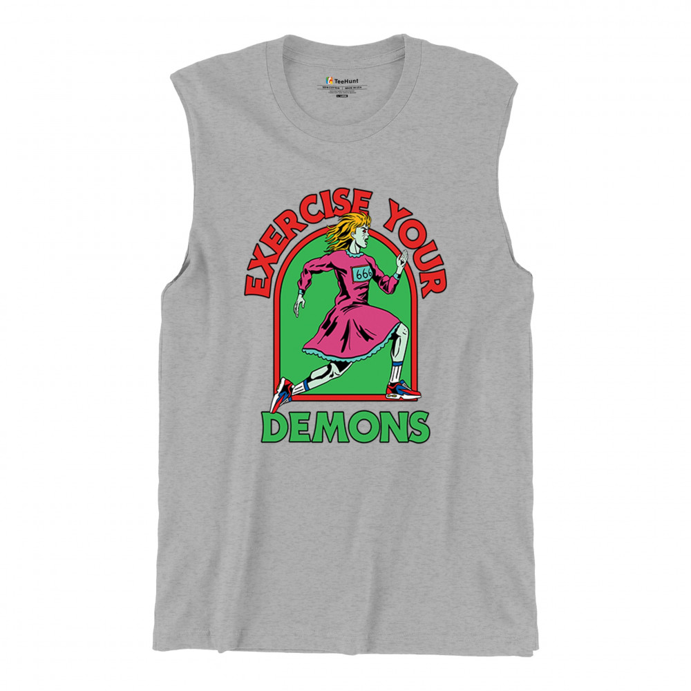 Exercise Your Demons shirt – funny halloween gym shirt with fitness humor, scary workout design, demon runner style, and spooky parody vibes.
