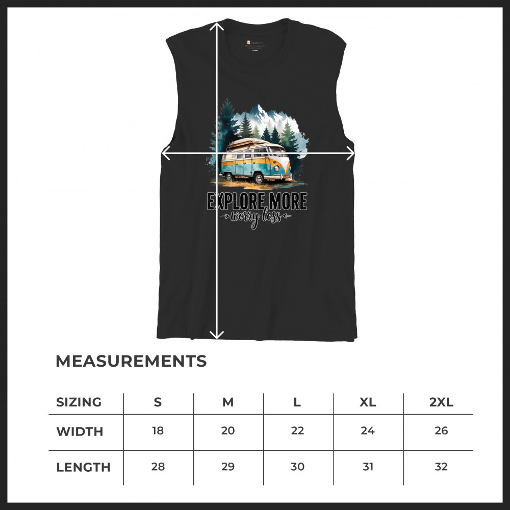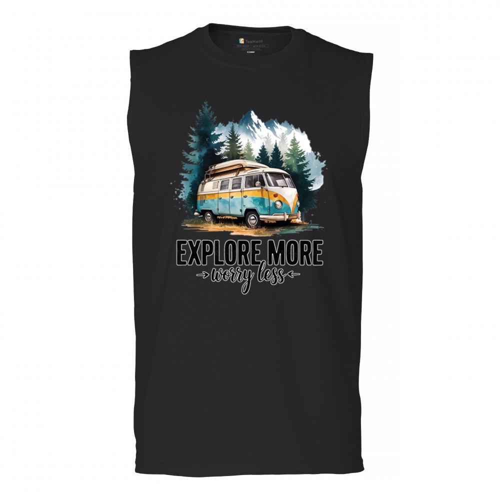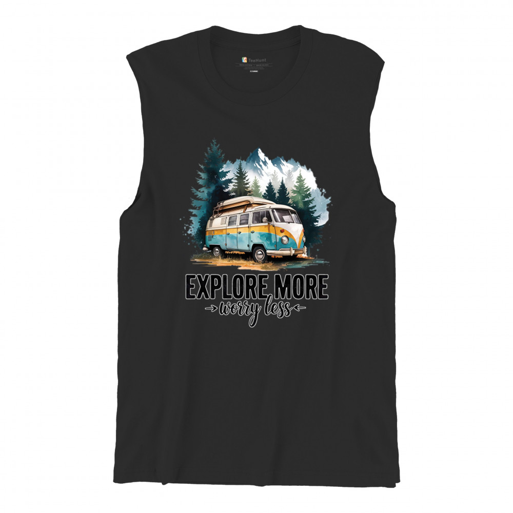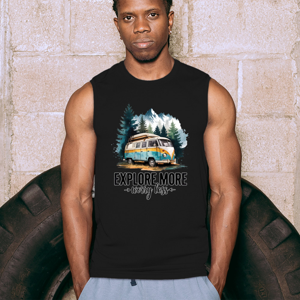 EXPLORE MORE WORRY LESS men's muscle shirt camping trail hiking tent life black