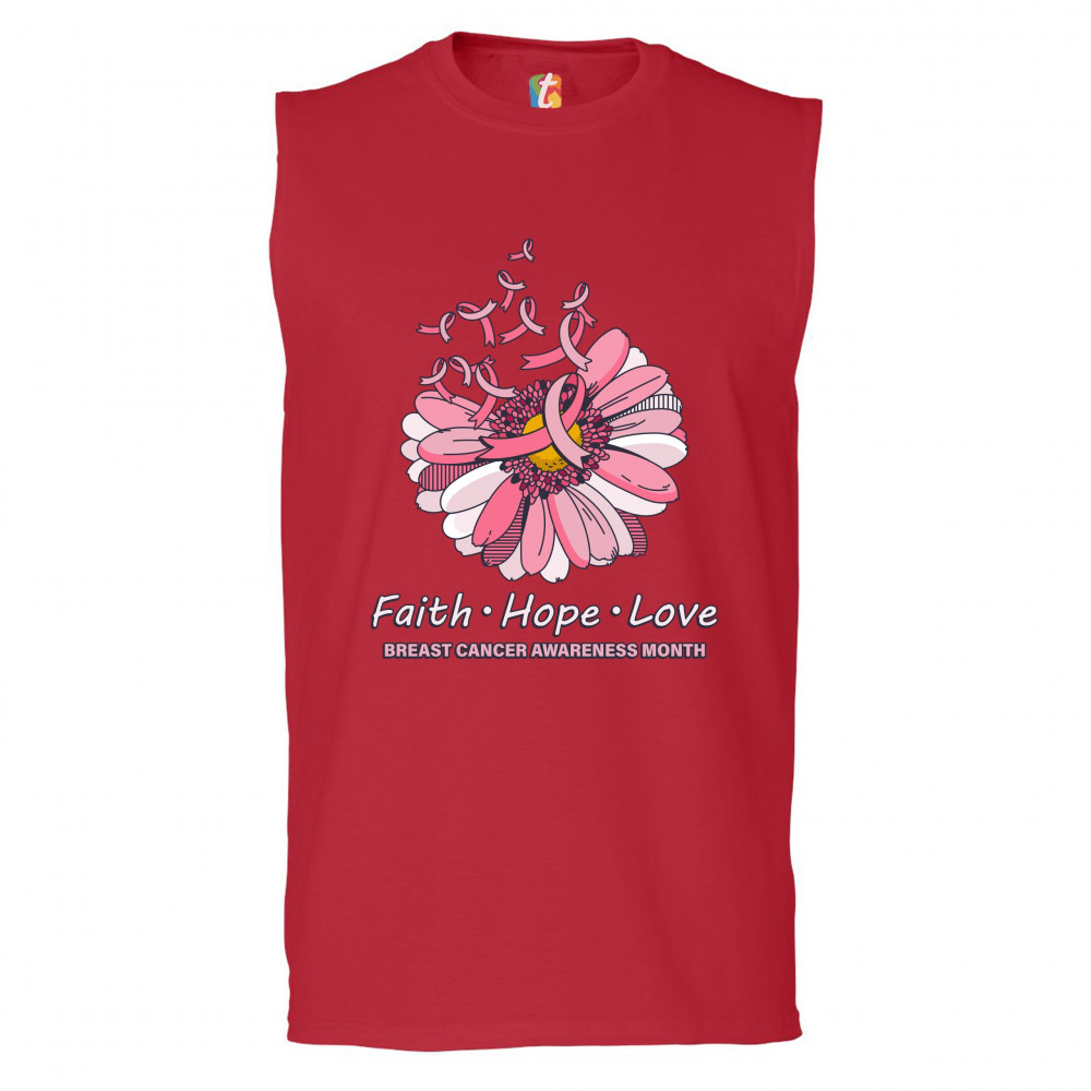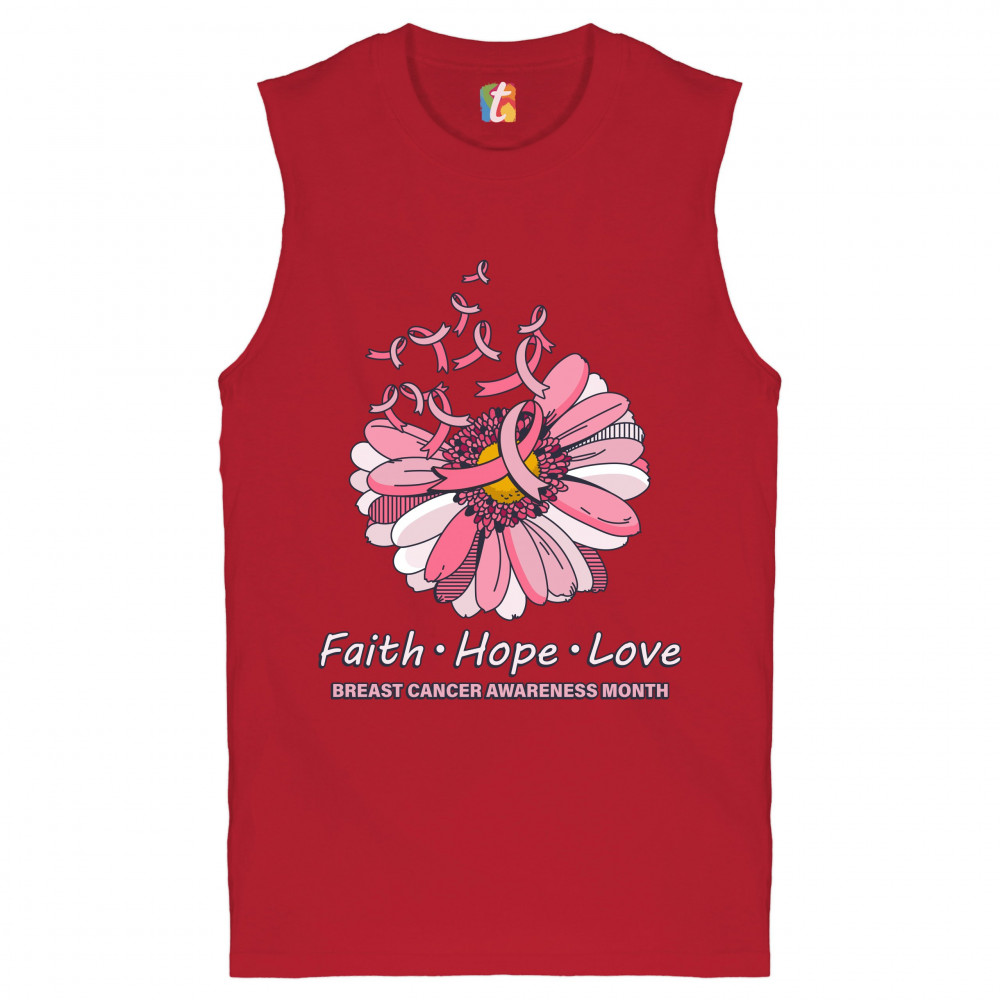 A print featuring a big flower with several petals missing and numerous pink ribbons flying away from it. The print says: "Faith Hope Love" and "Breast Cancer Awareness Month". Wear it to spread awareness abouth the disease and support a person you know w
