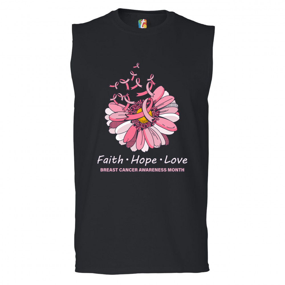 A print featuring a big flower with several petals missing and numerous pink ribbons flying away from it. The print says: "Faith Hope Love" and "Breast Cancer Awareness Month". Wear it to spread awareness abouth the disease and support a person you know w