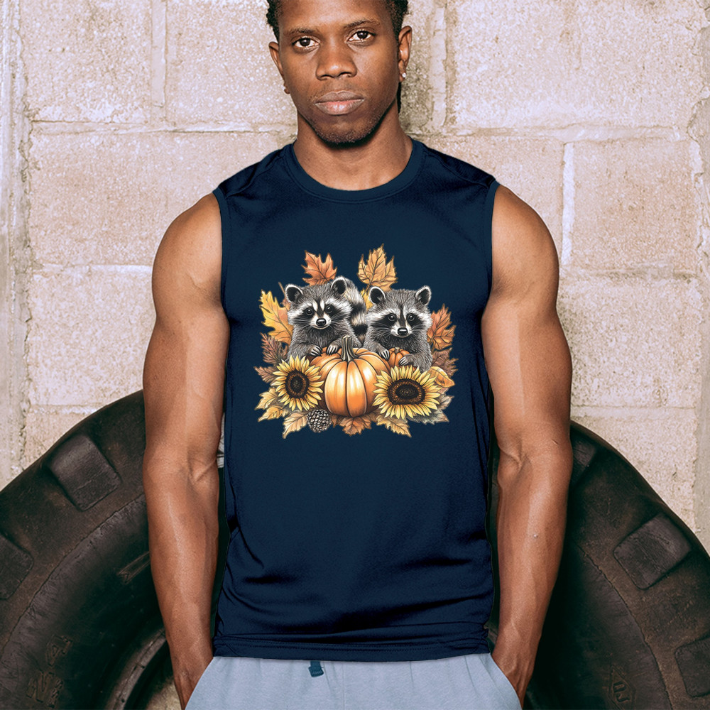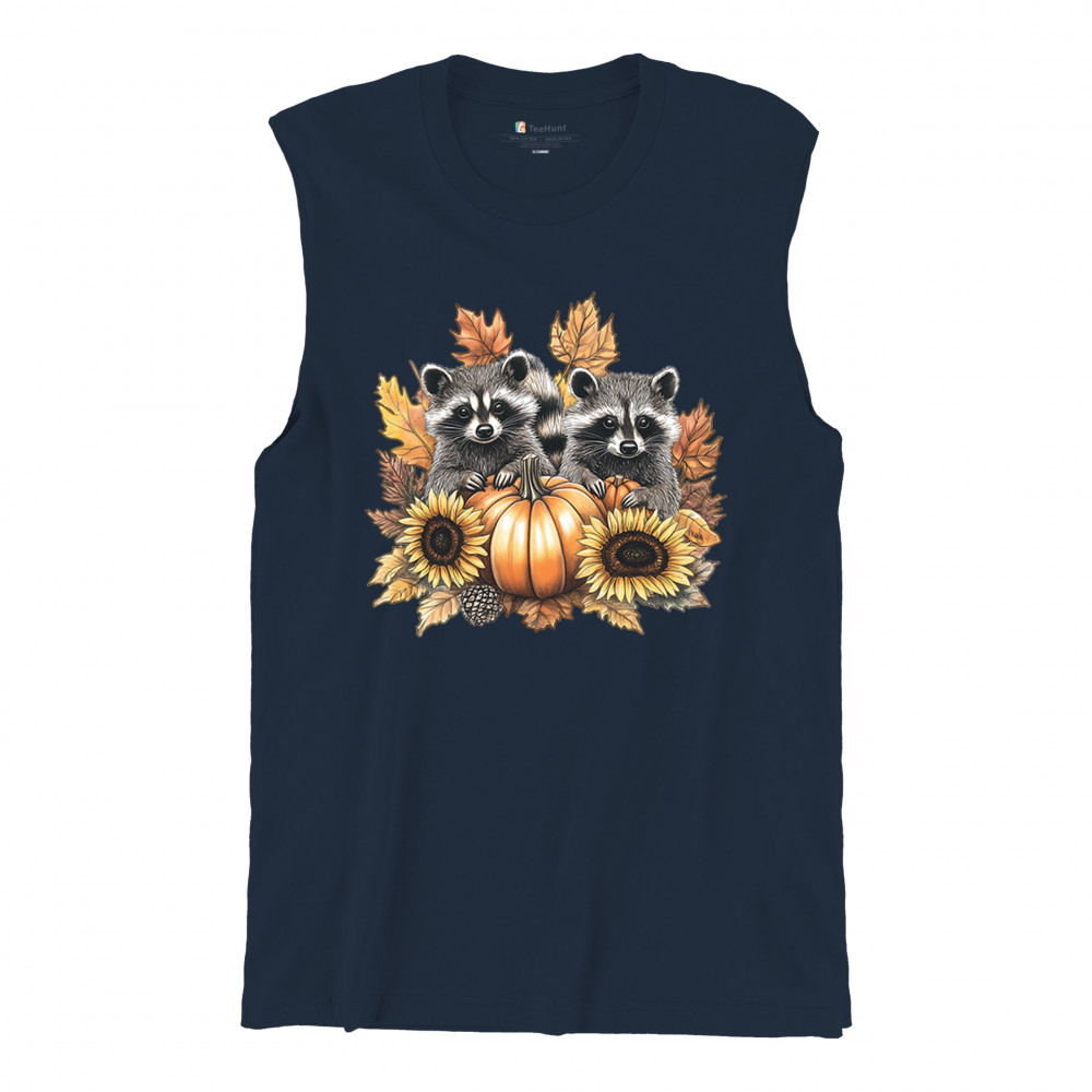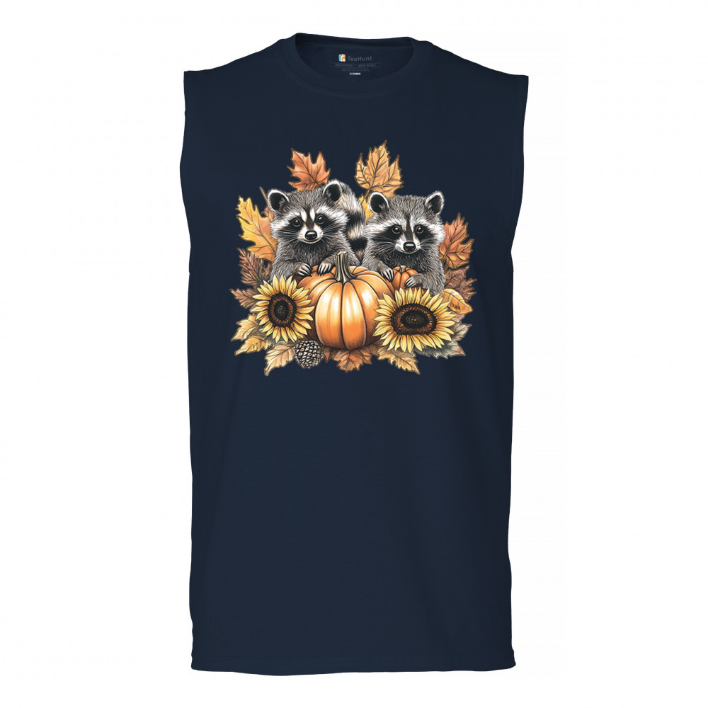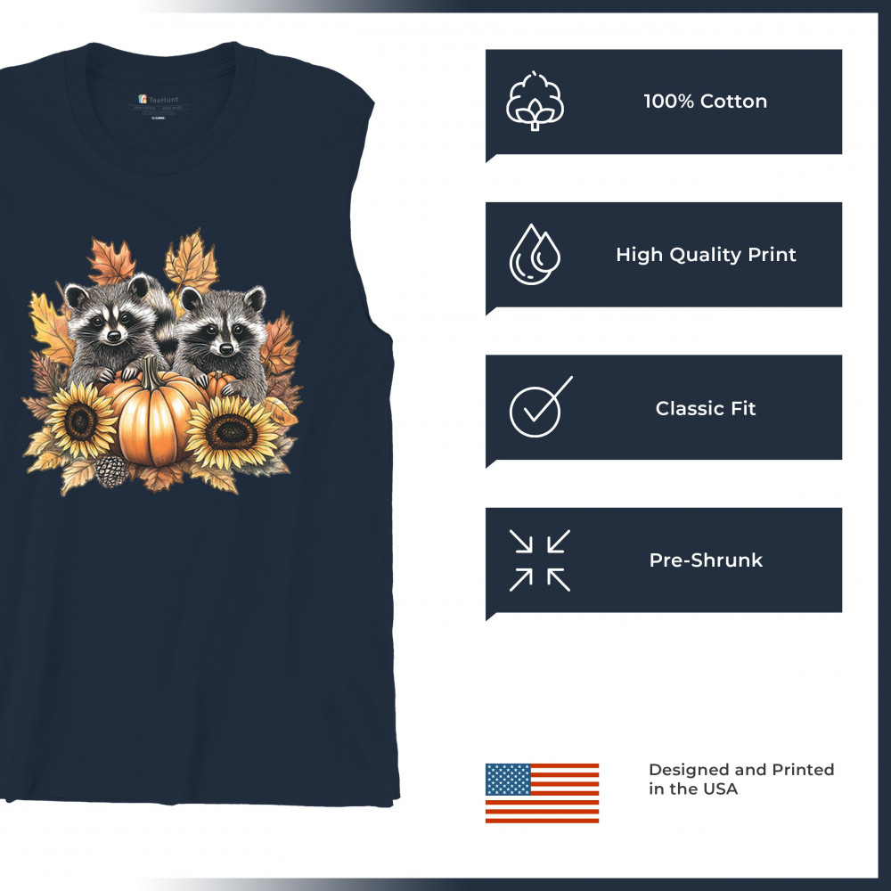 Rustic autumn raccoon design with pumpkins and sunflowers. Perfect for Thanksgiving, pumpkin patch days, farmhouse harvest, and woodland fall fashion.