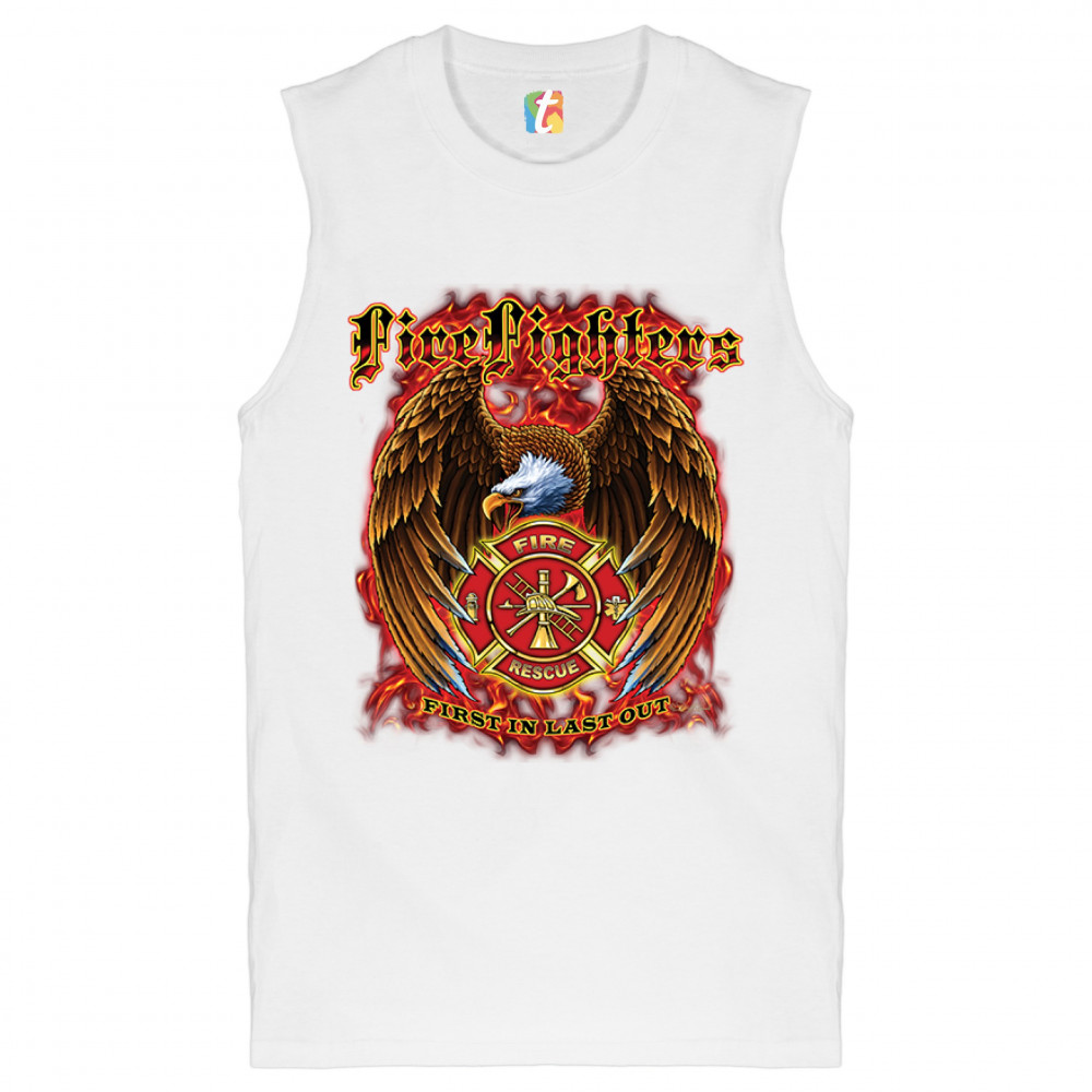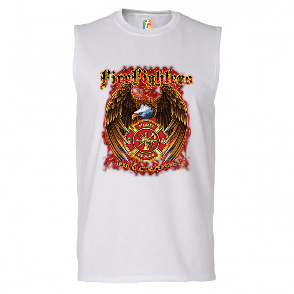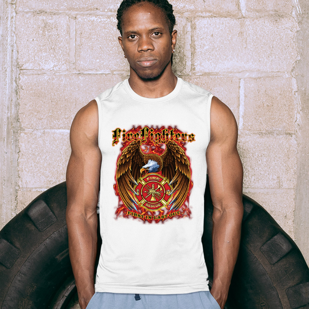 FIREFIGHTERS FIRST IN LAST OUT muscle shirt fire and rescue bald eagle men's white