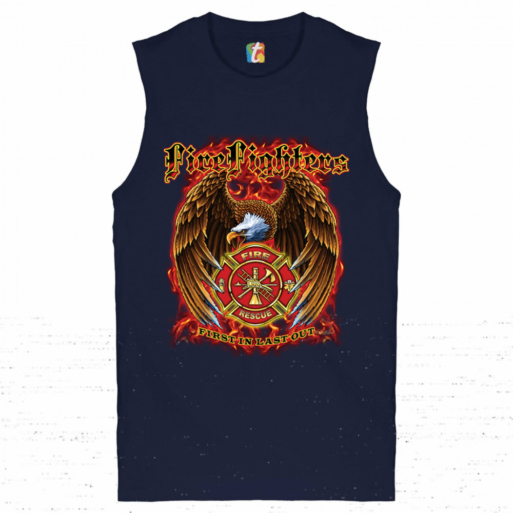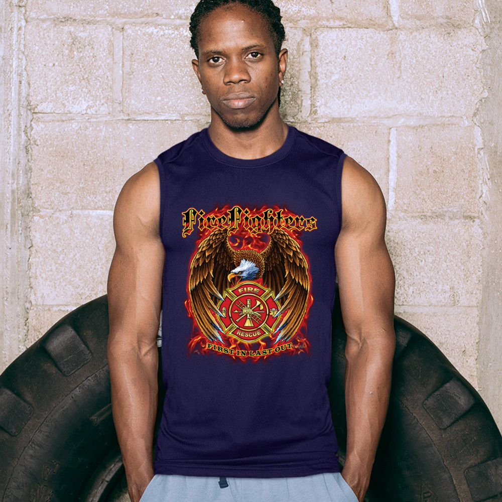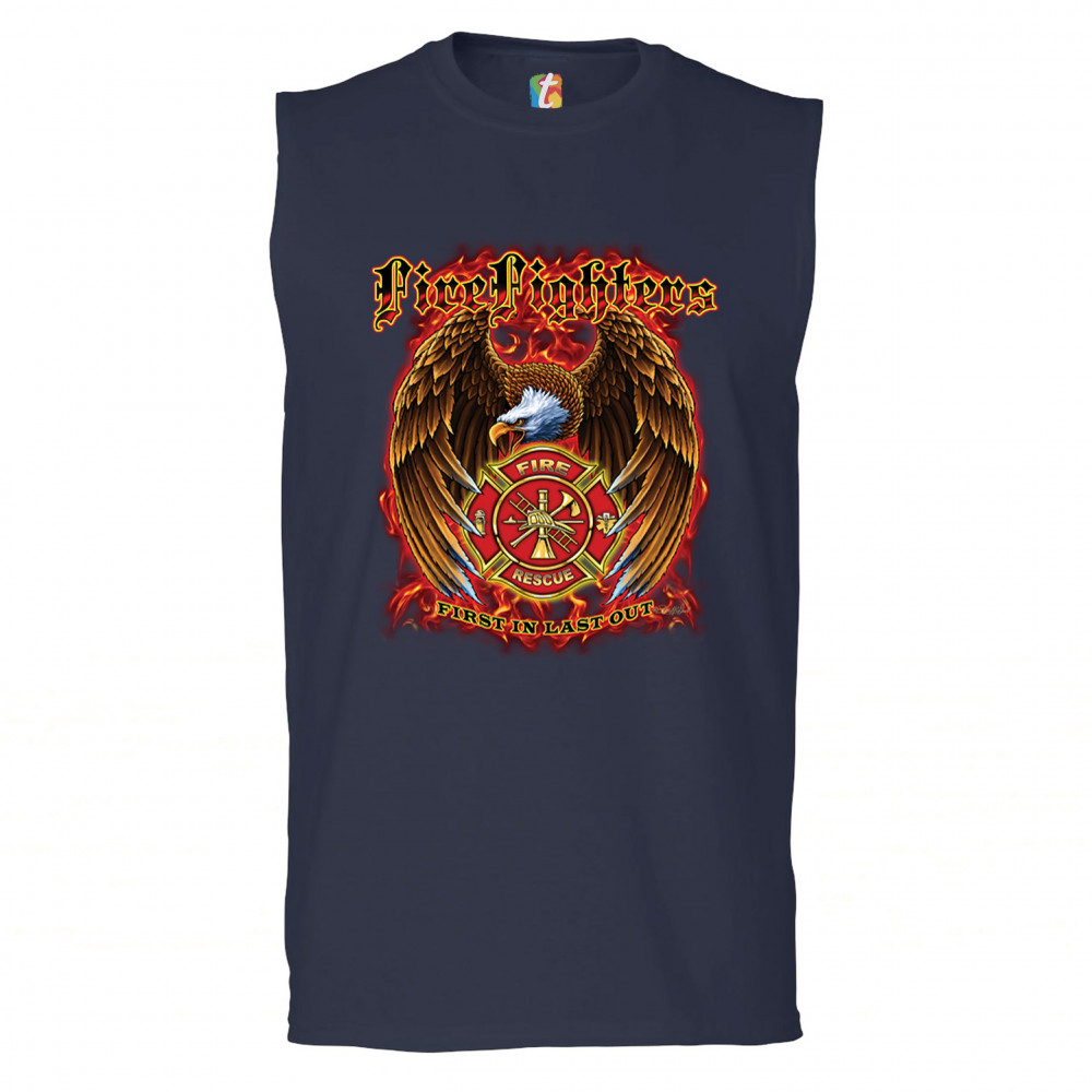 FIREFIGHTERS FIRST IN LAST OUT muscle shirt fire and rescue bald eagle men's navy blue