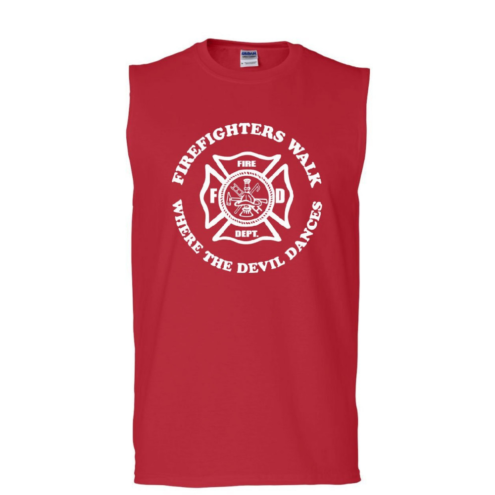 FIREFIGHTERS WALK WHERE DEVIL DANCES muscle shirt fire and rescue sleeveless red