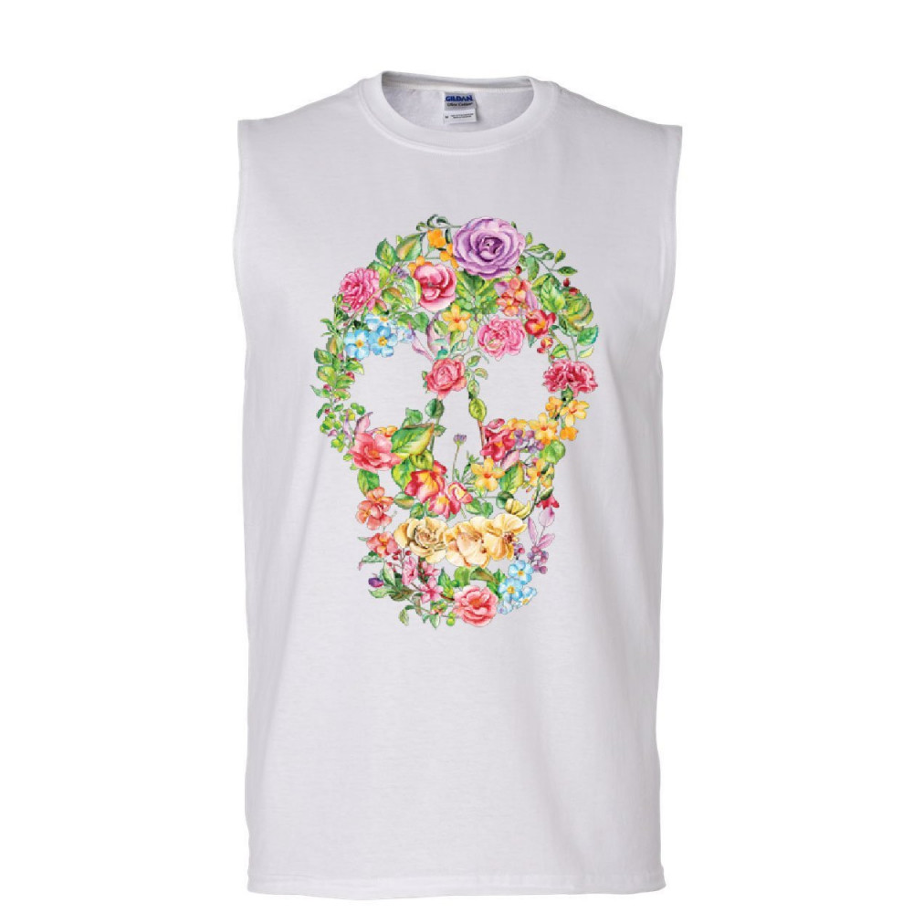 FLOWER SKULL muscle shirt sugar skull calavera dia de los muertos sleeveless white