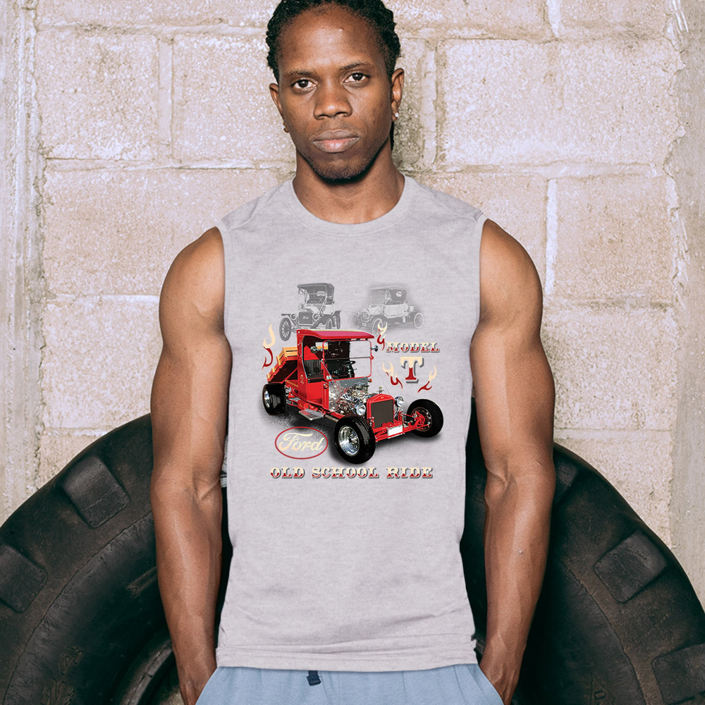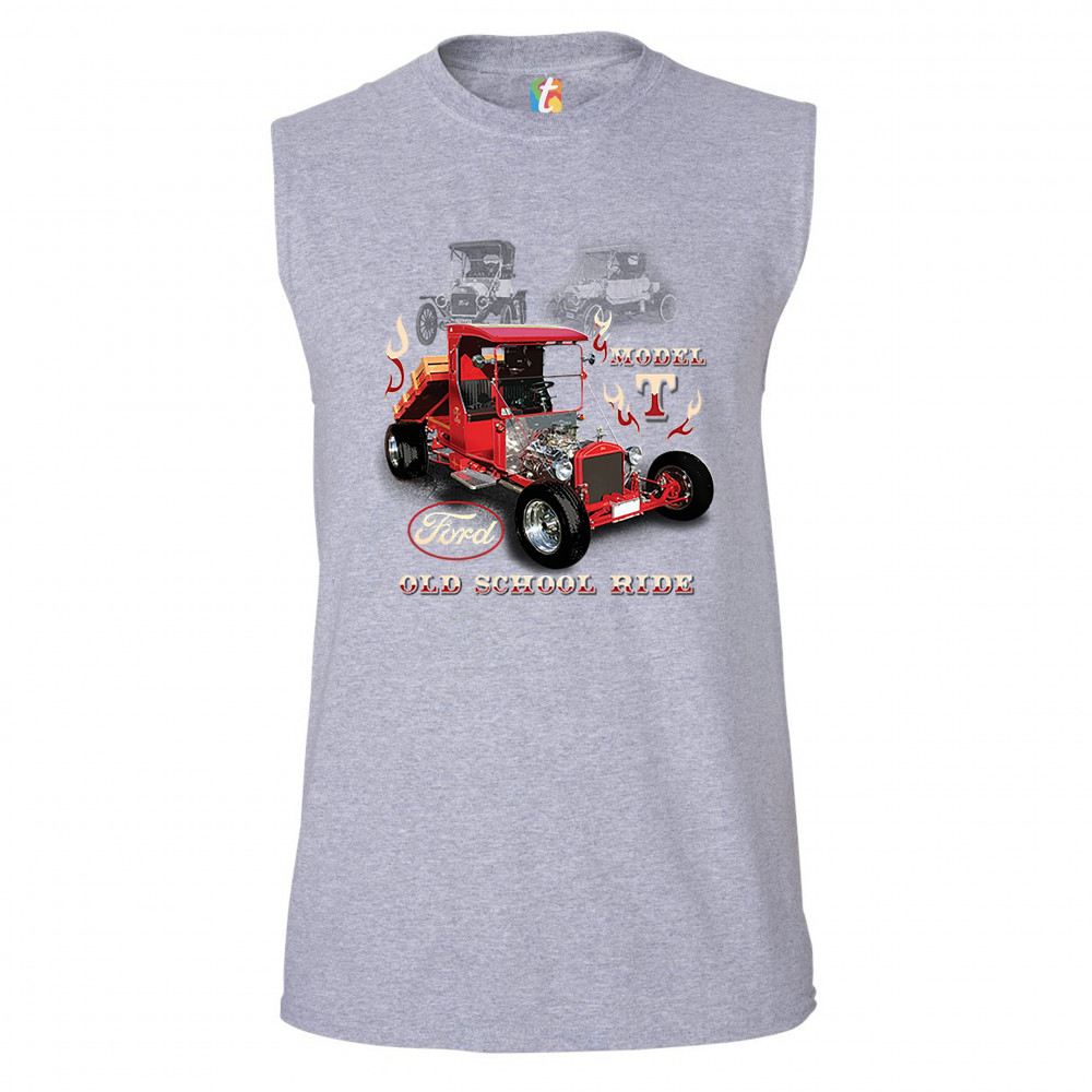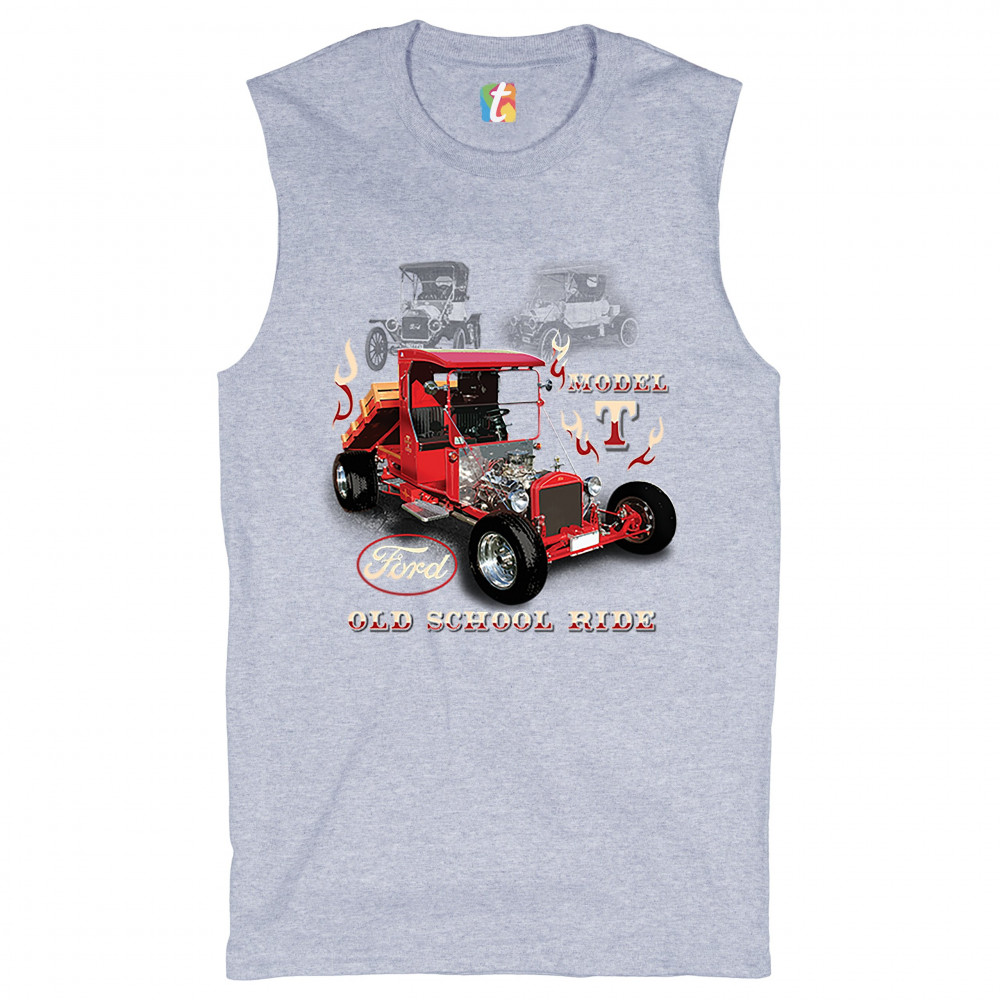A print featuring a Ford Model T modified as a hot rod. The are also two transparent pictures of original T Models in the background. The print features the Ford logo and says: "Model T, Old School Ride". A great choice for anyone who is a fan of old sch