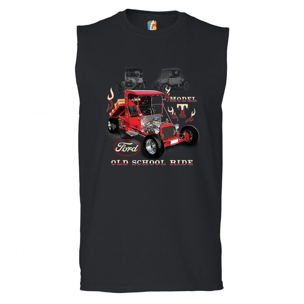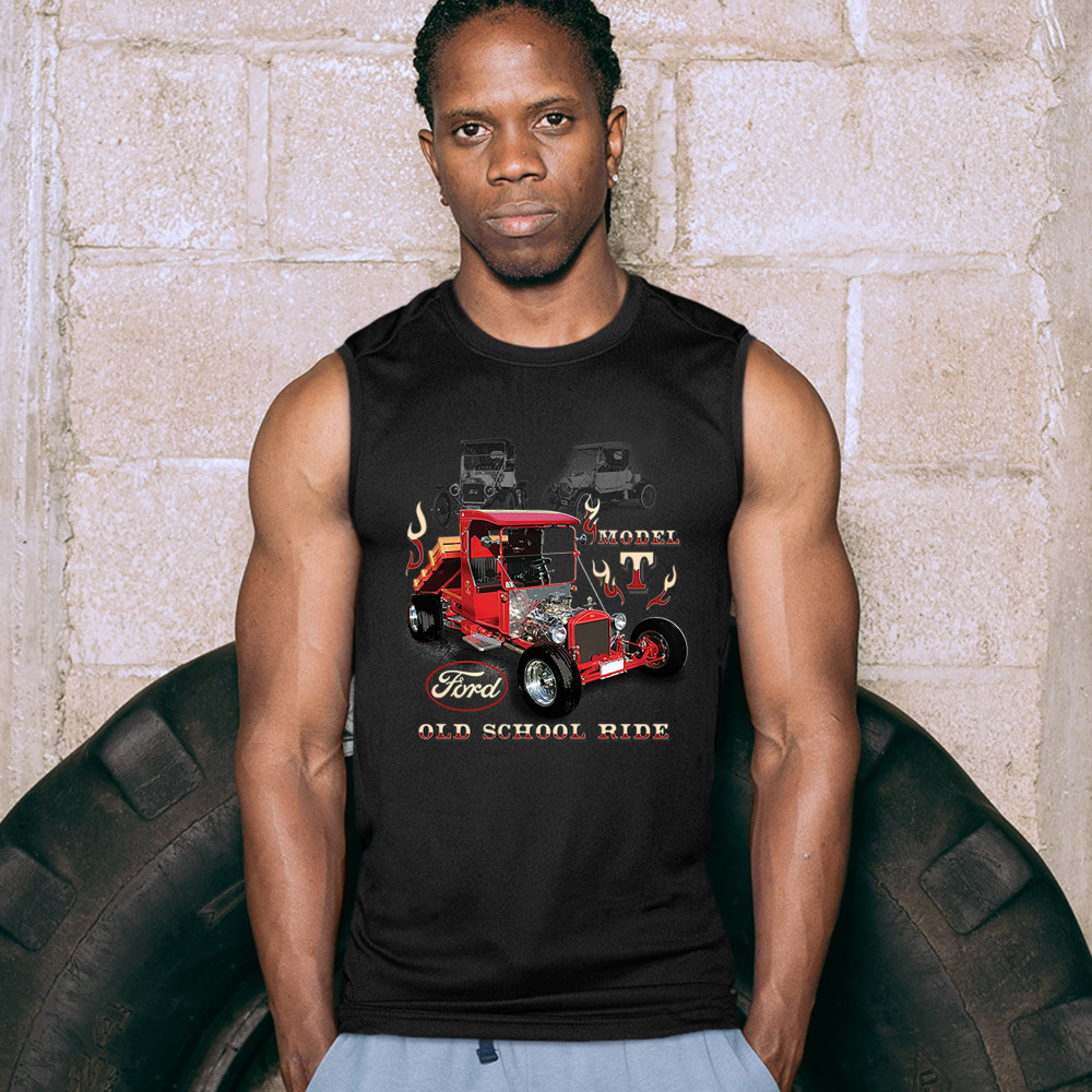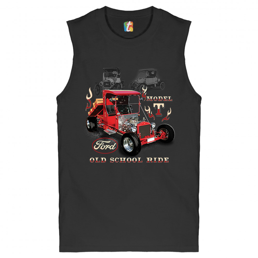 A print featuring a Ford Model T modified as a hot rod. The are also two transparent pictures of original T Models in the background. The print features the Ford logo and says: "Model T, Old School Ride". A great choice for anyone who is a fan of old sch