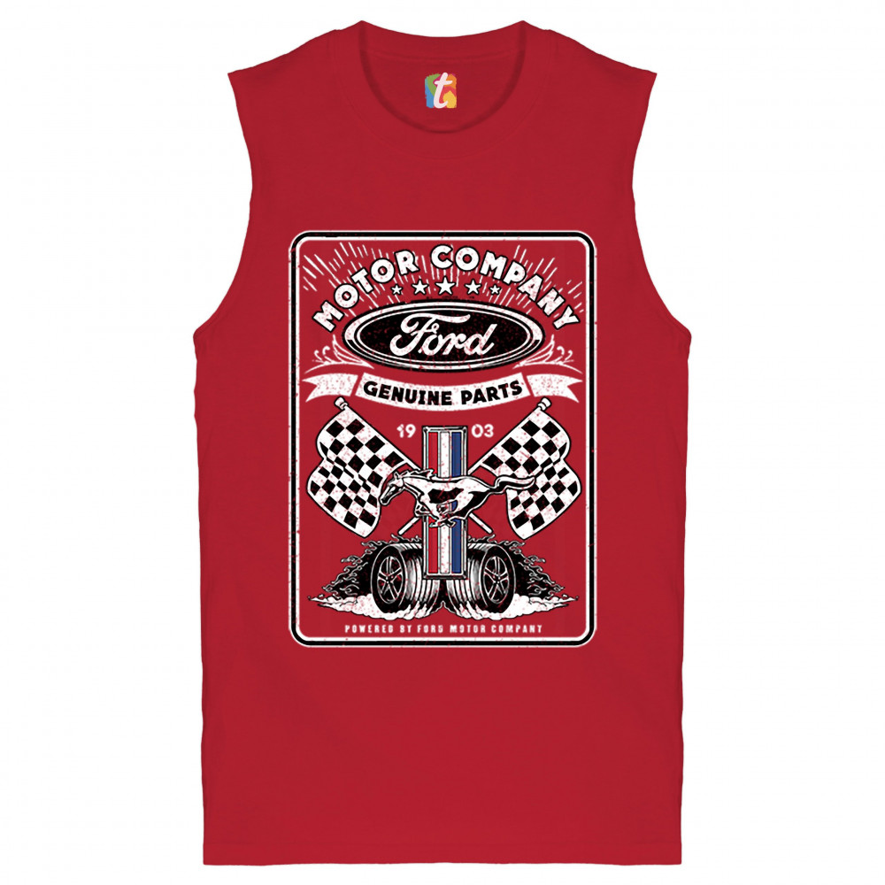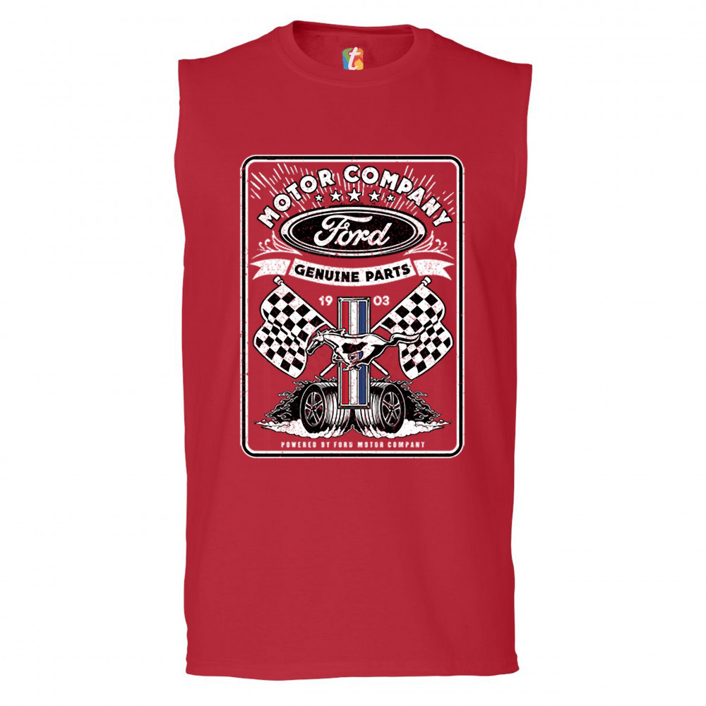 A print featuring Ford logo in the top, Mustang logo in the center, two racing flags and two rolling wheels. The prints says: "Ford Motor Company Genuine Parts 1903" in the top and "Powered by Ford Motor Company" in the bottom. A great choice for anyone w