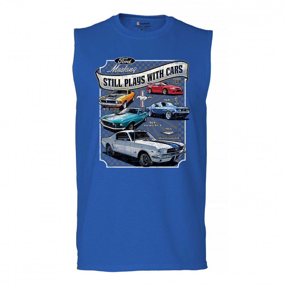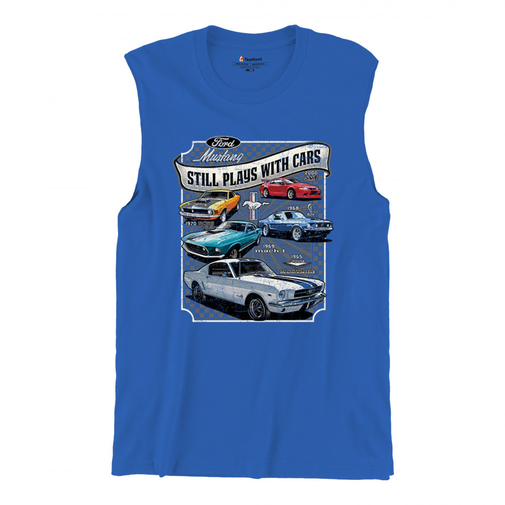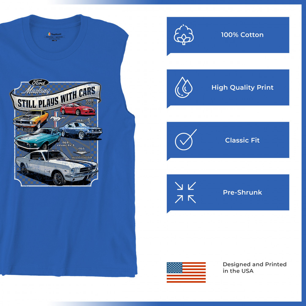 This bold Ford Mustang "Still Plays With Cars" design showcases six classic models from 1965 to 2000, including the 1969 Mach 1, 1970 Boss 302, and 2000 SVT. A dream graphic for muscle car lovers, collectors, and pony car fans. Great for classic auto shows, retro cruises, garage wear, or car clubs.