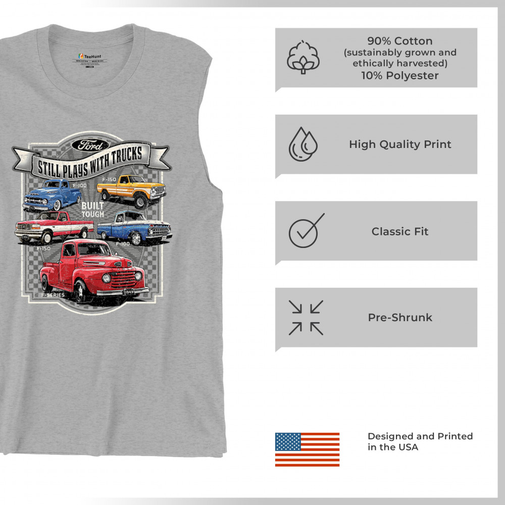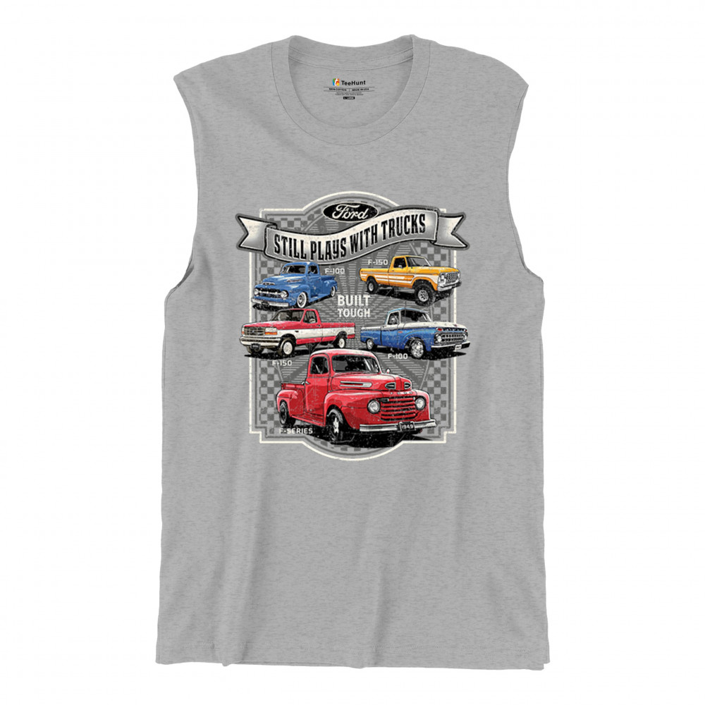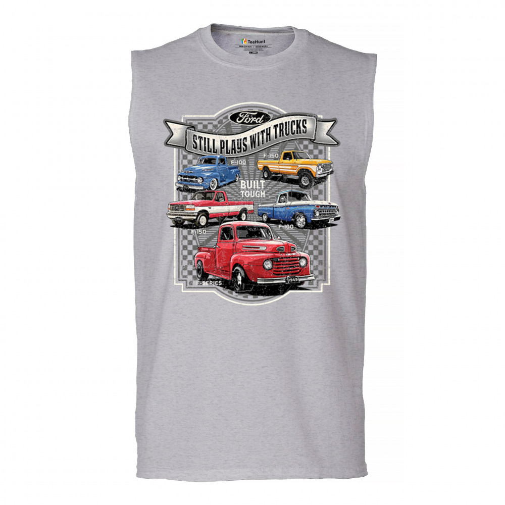 Features classic Ford F-Series trucks from 1949 to F-150. Great for vintage truck fans, garage wear, car shows, and collectors who love pickups.