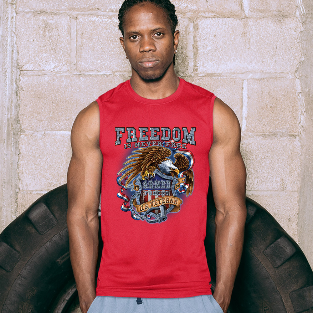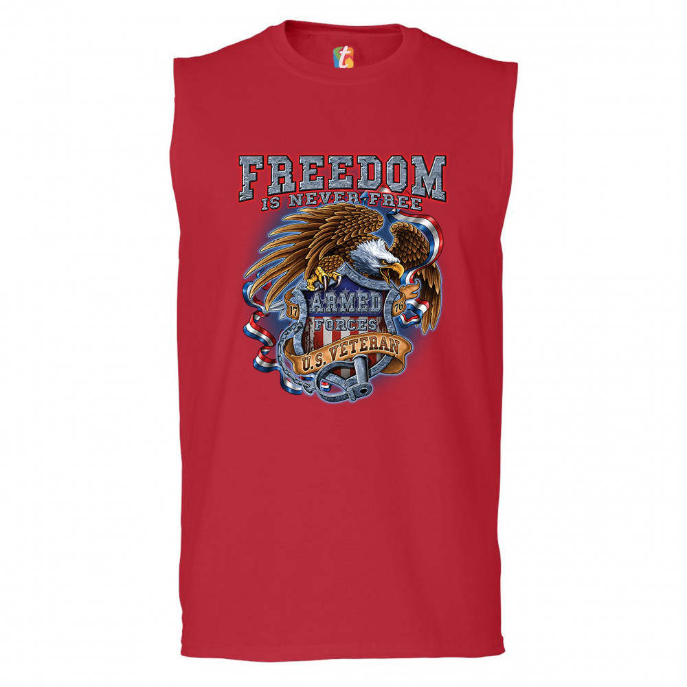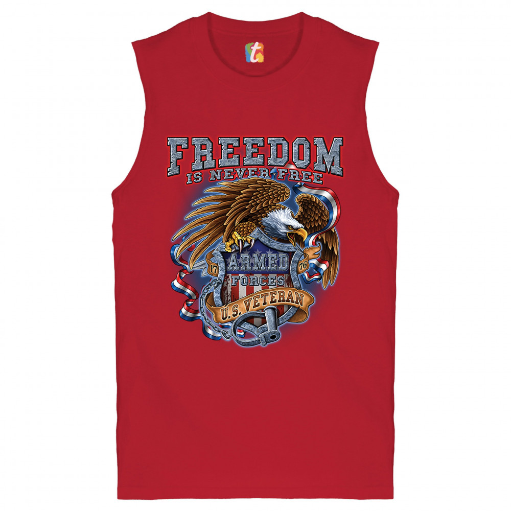 A patriotic print featuring a bald eagle holding a shield with an American Flag and "Armed Forces" written on it. The print says: "Freedom Is Never Free, 1776, U.S. Veteran". Great choice to wear on Independence Day or any other patriotic holiday.
