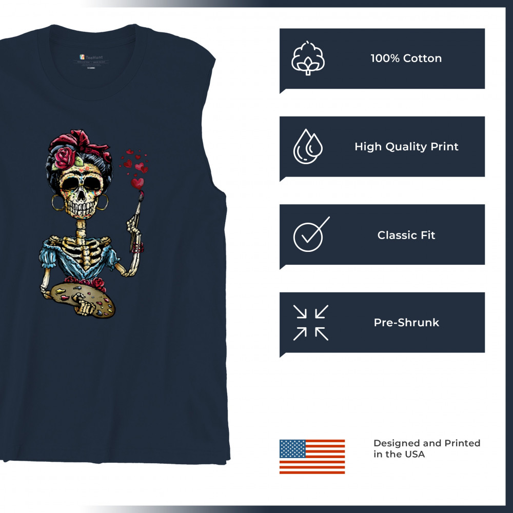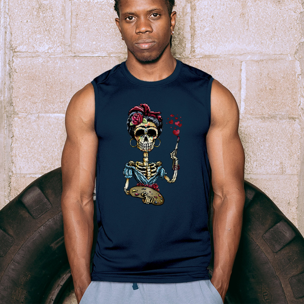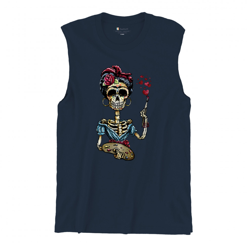 FRIDA KAHLO SUGAR SKULL muscle shirt calavera mexican day of the dead men's navy blue