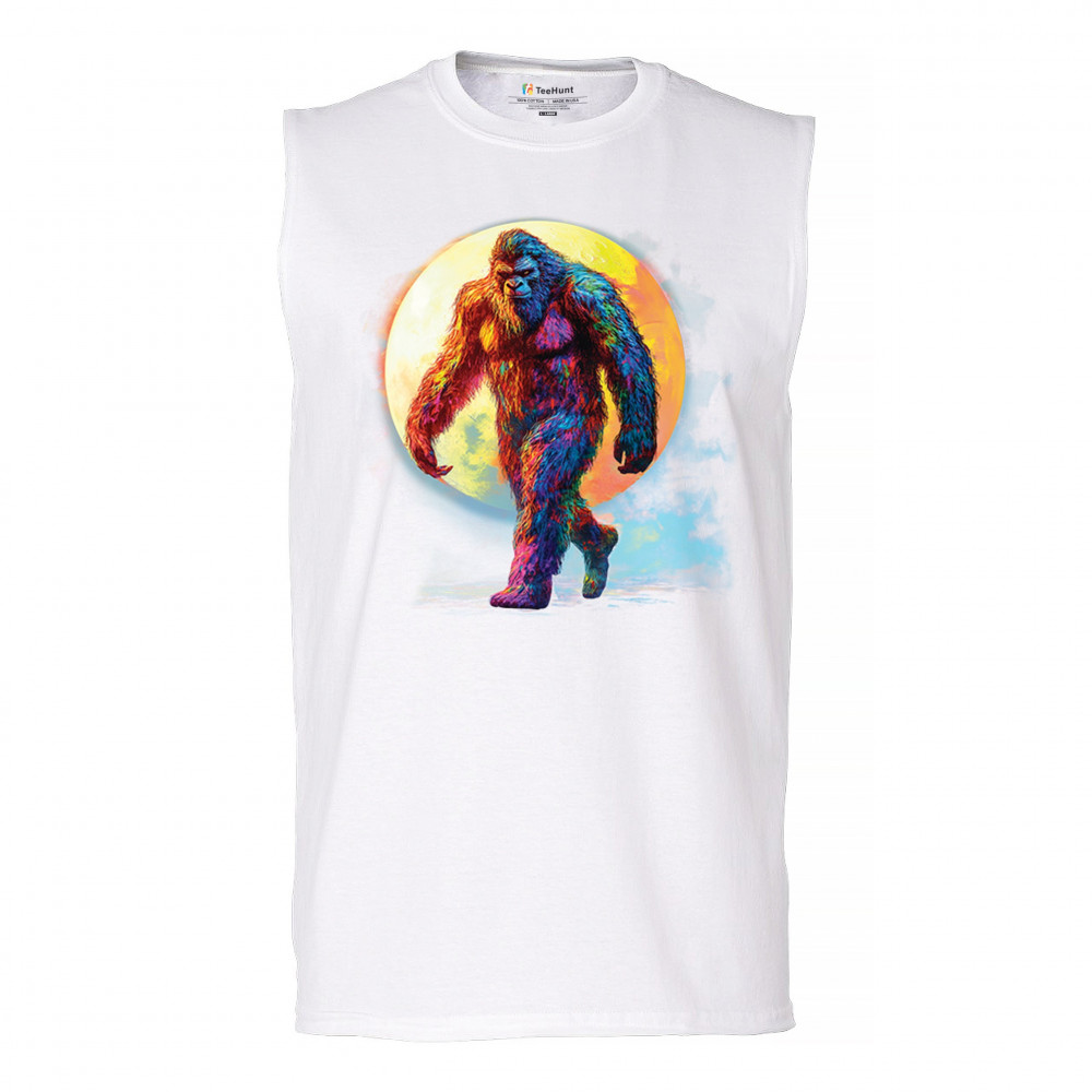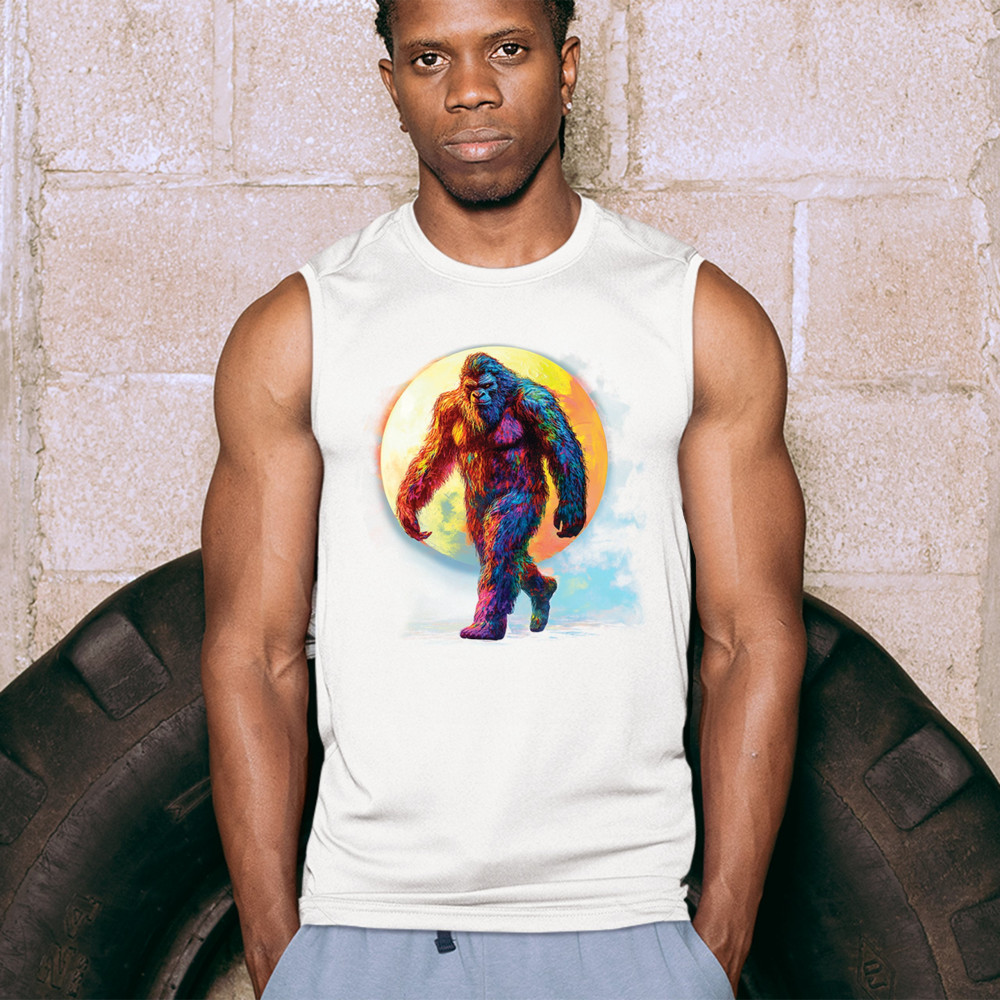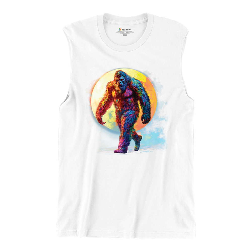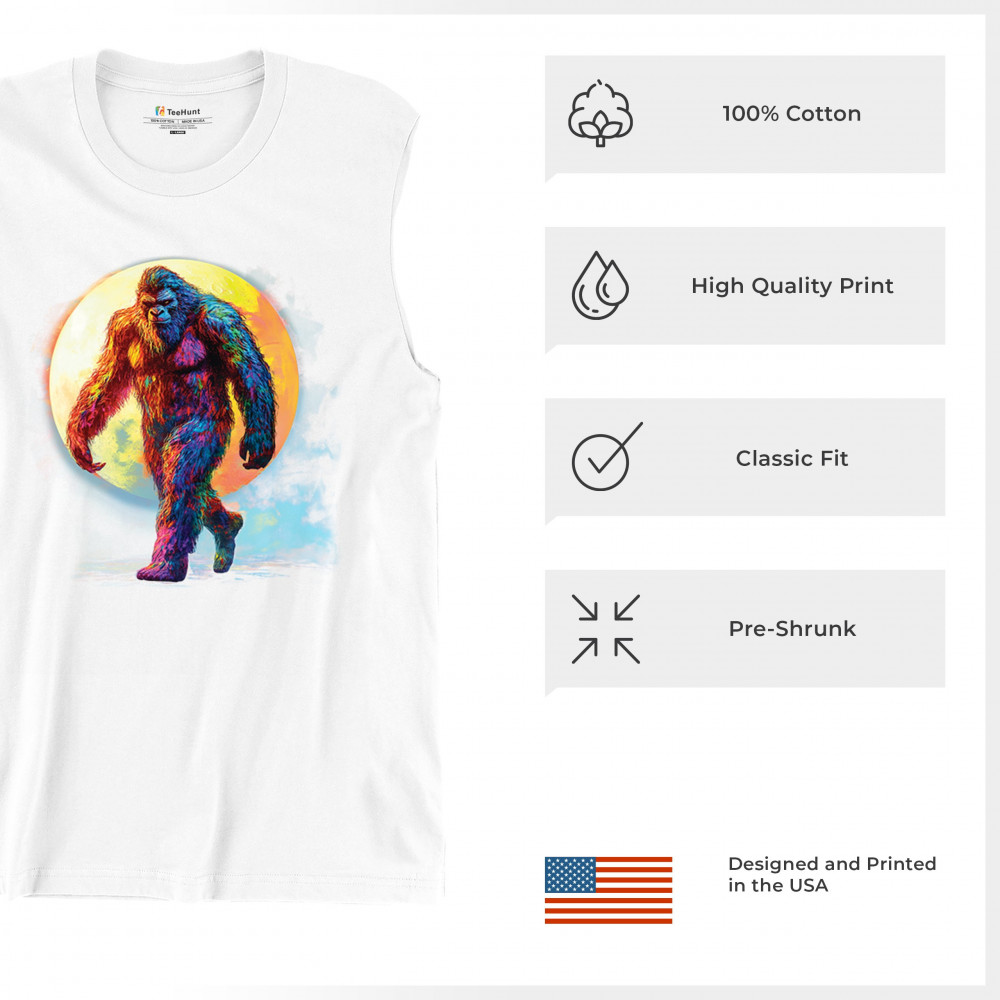 Rainbow Bigfoot under full moon design for cryptid lovers, festival goers, and psychedelic art fans. Bold, surreal, and eye-catching.