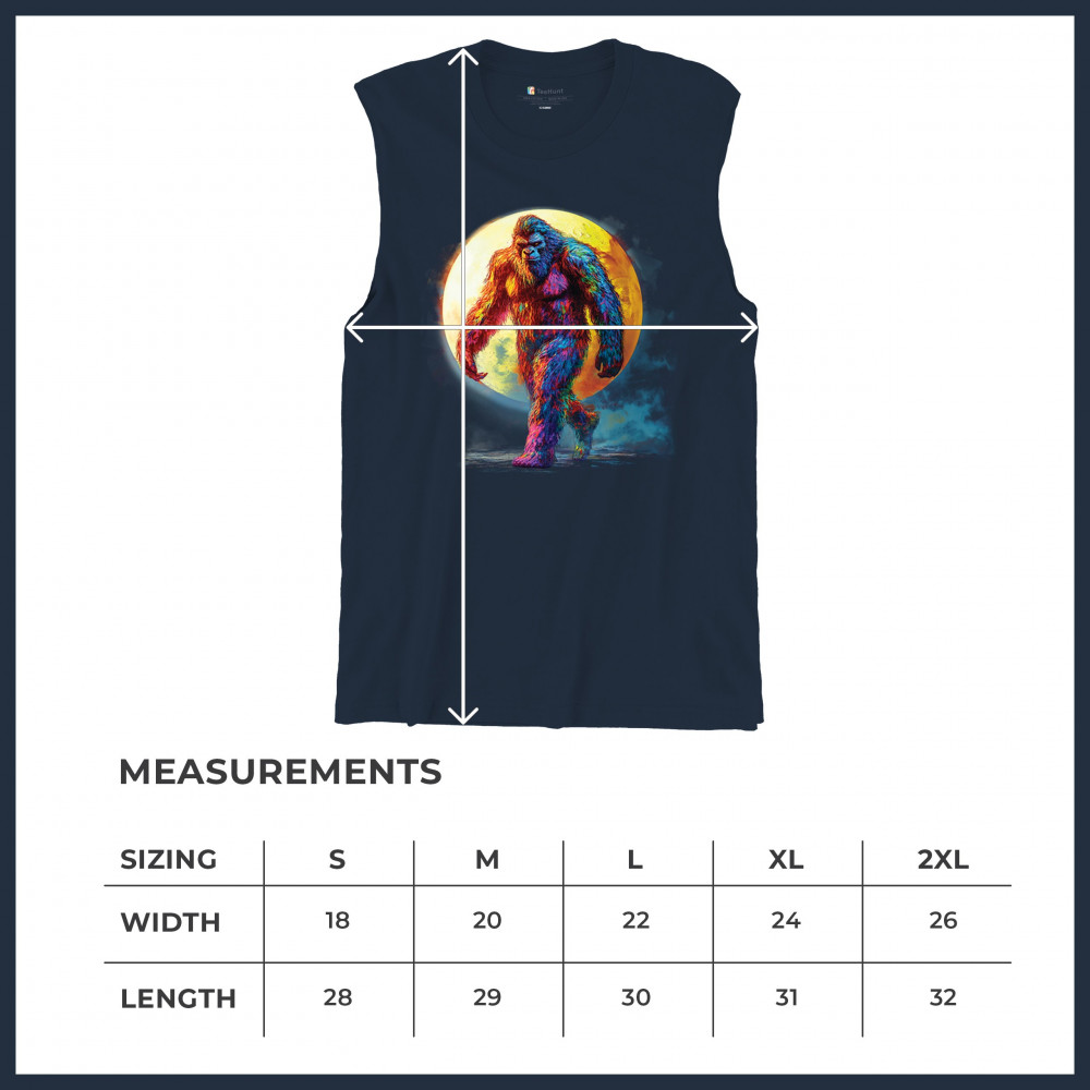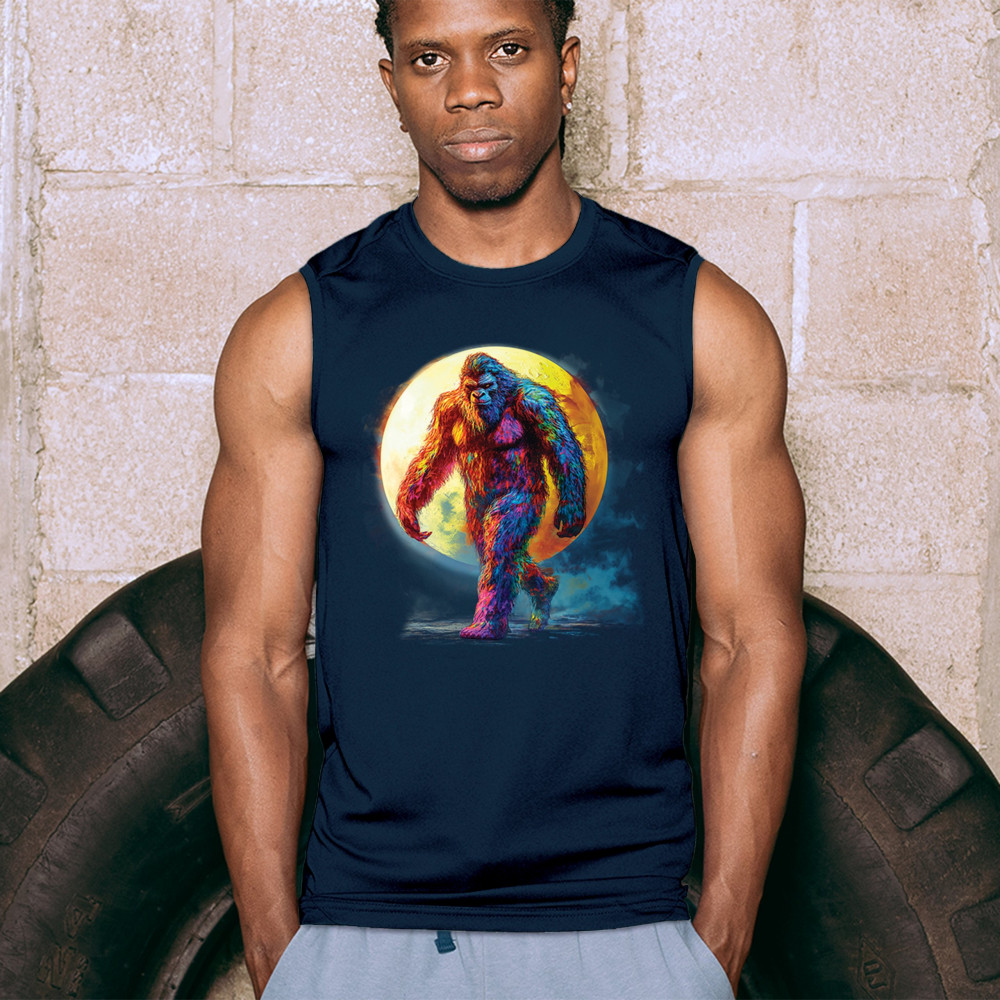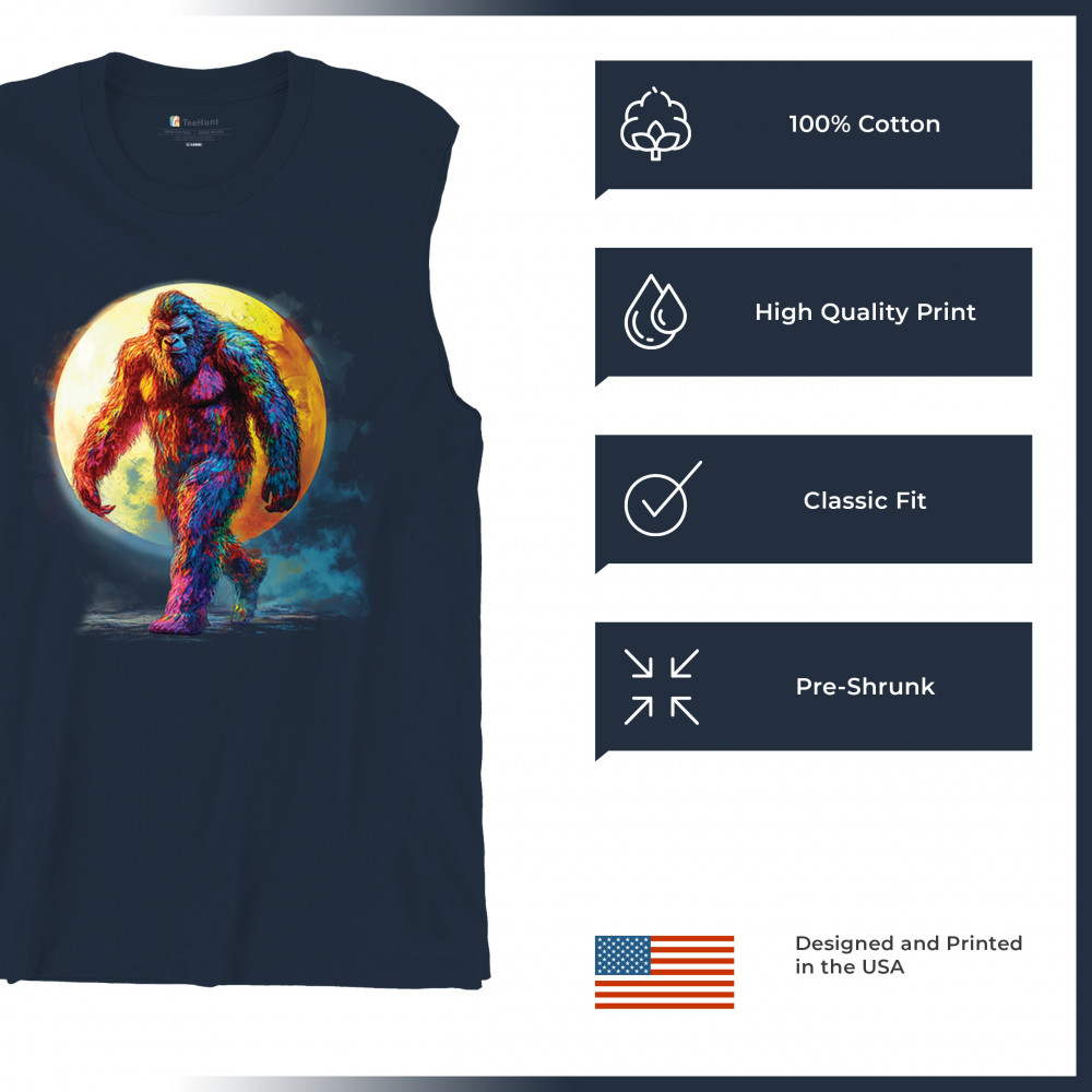 Rainbow Bigfoot under full moon design for cryptid lovers, festival goers, and psychedelic art fans. Bold, surreal, and eye-catching.