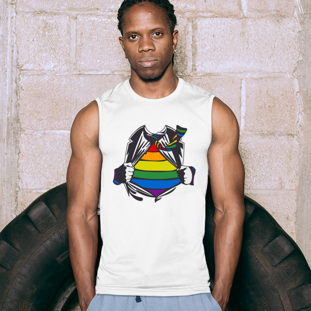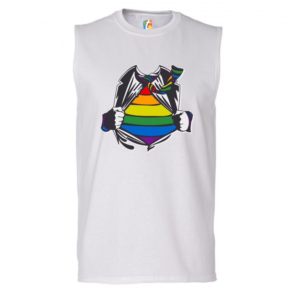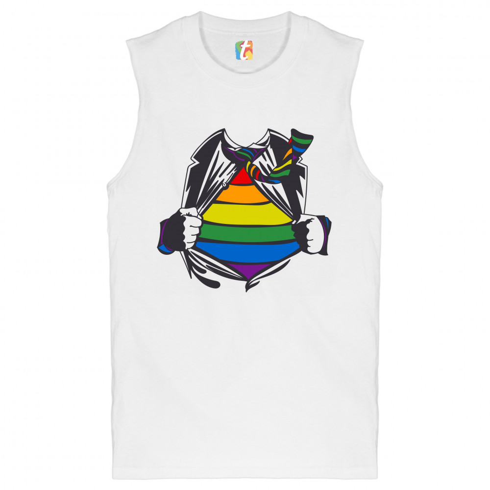 GAY SUPERHERO PARODY muscle shirt lesbian bi transgender pride rainbow men's white