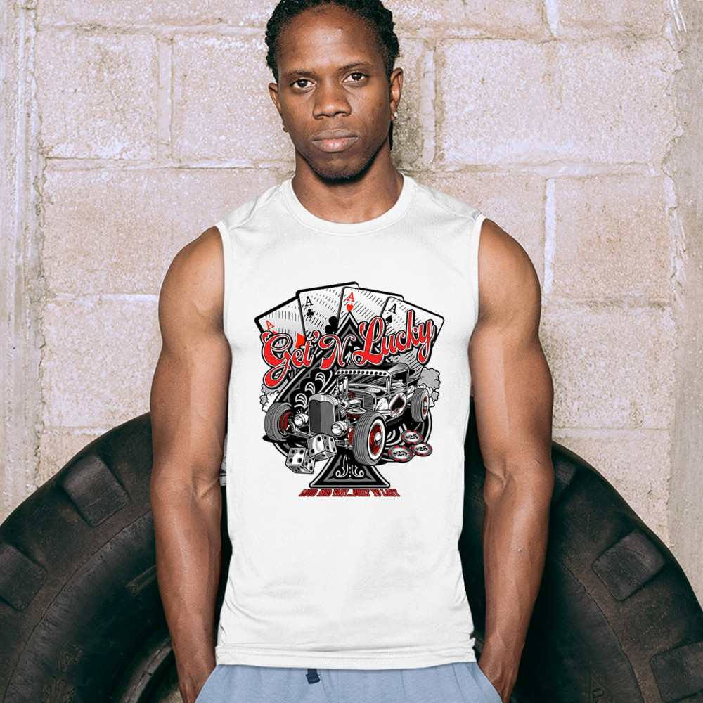 A print featuring a hot rod and a giant ace of spades behind it. In the background there are four aces of every suit. In front of the car there are 2 dices and several casino chips. The print says: "Get'n lucky, louad and fast… built to last". A great cho