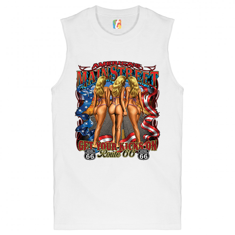 A print featuring three scantily-clad blondes holding each other's hands walking on a highway. The print says: "America's Main Street, Get Your Kicks on Route 66" and also features a ribbon with stars and stripes on it and two "Historic Route 66" signs. A