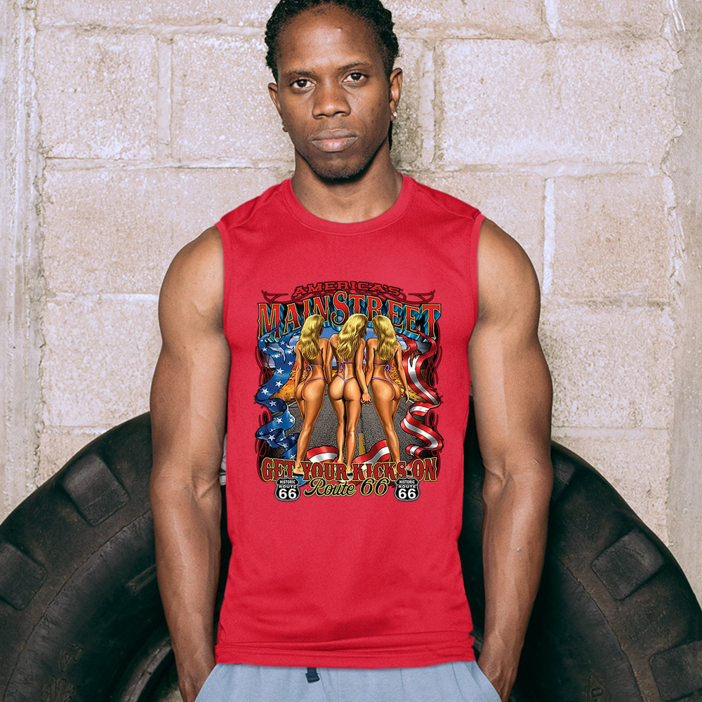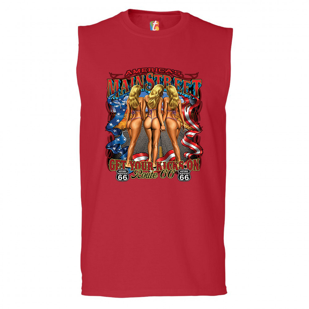 A print featuring three scantily-clad blondes holding each other's hands walking on a highway. The print says: "America's Main Street, Get Your Kicks on Route 66" and also features a ribbon with stars and stripes on it and two "Historic Route 66" signs. A