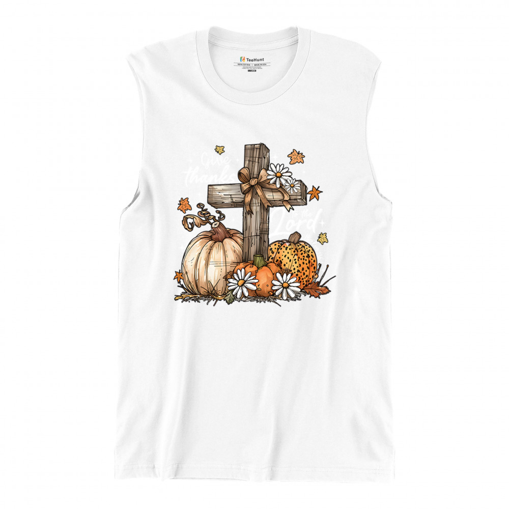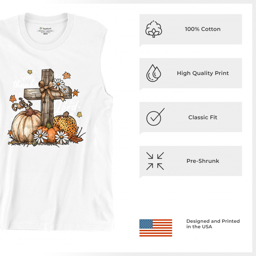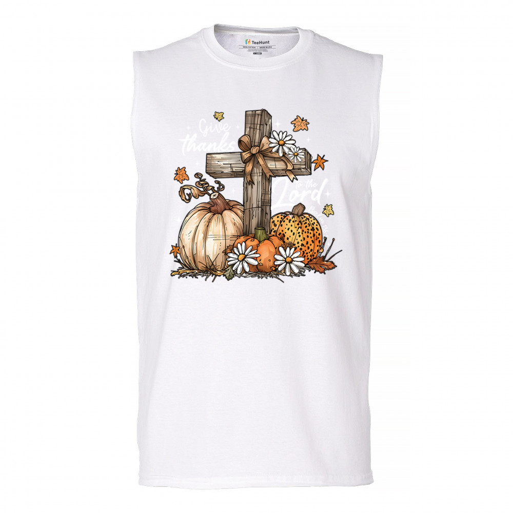 Thanksgiving design with pumpkins, daisies, and rustic cross. Perfect for Turkey Day, faithful family gatherings, and fall festival blessings.