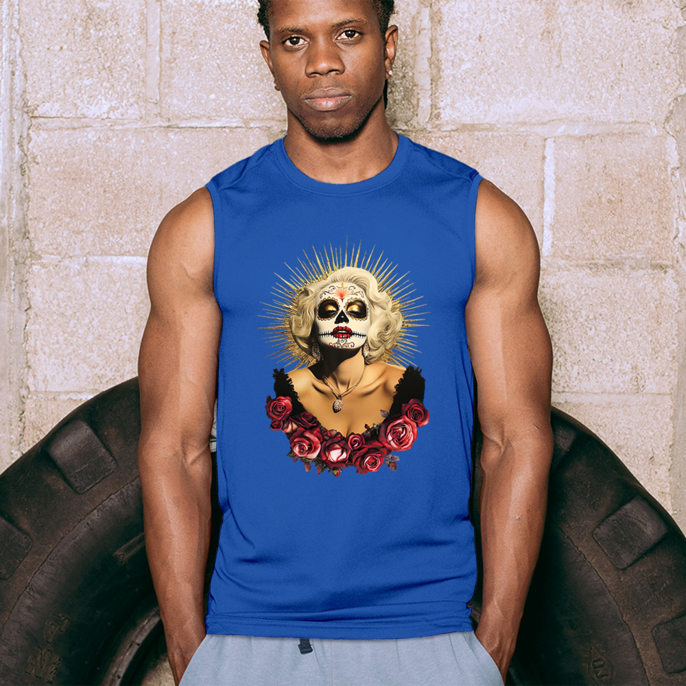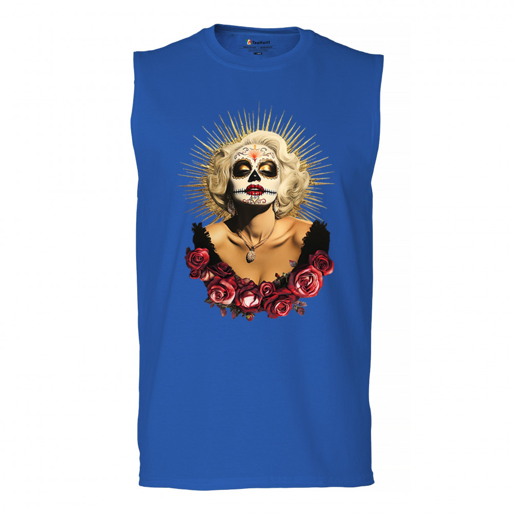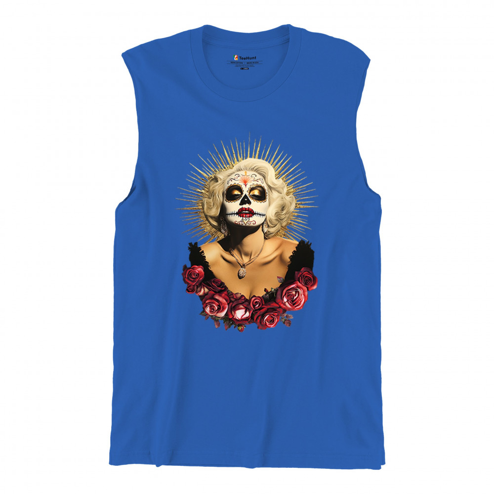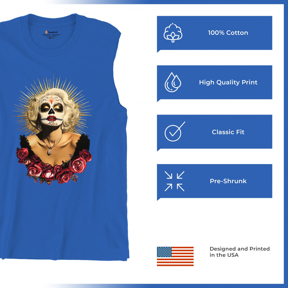 This bold and beautiful sugar skull design features a glamorous calavera woman crowned in a golden halo and framed by roses. A divine tribute to Dia de los Muertos, this look blends vintage glam, Latin culture, makeup artistry, and sacred symbolism. Perfect for fans of gothic beauty, Halloween, and heritage expression.