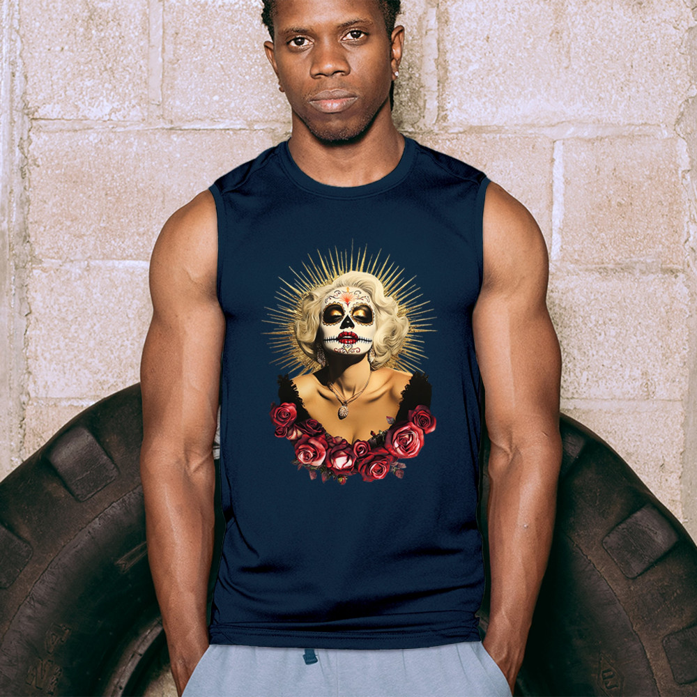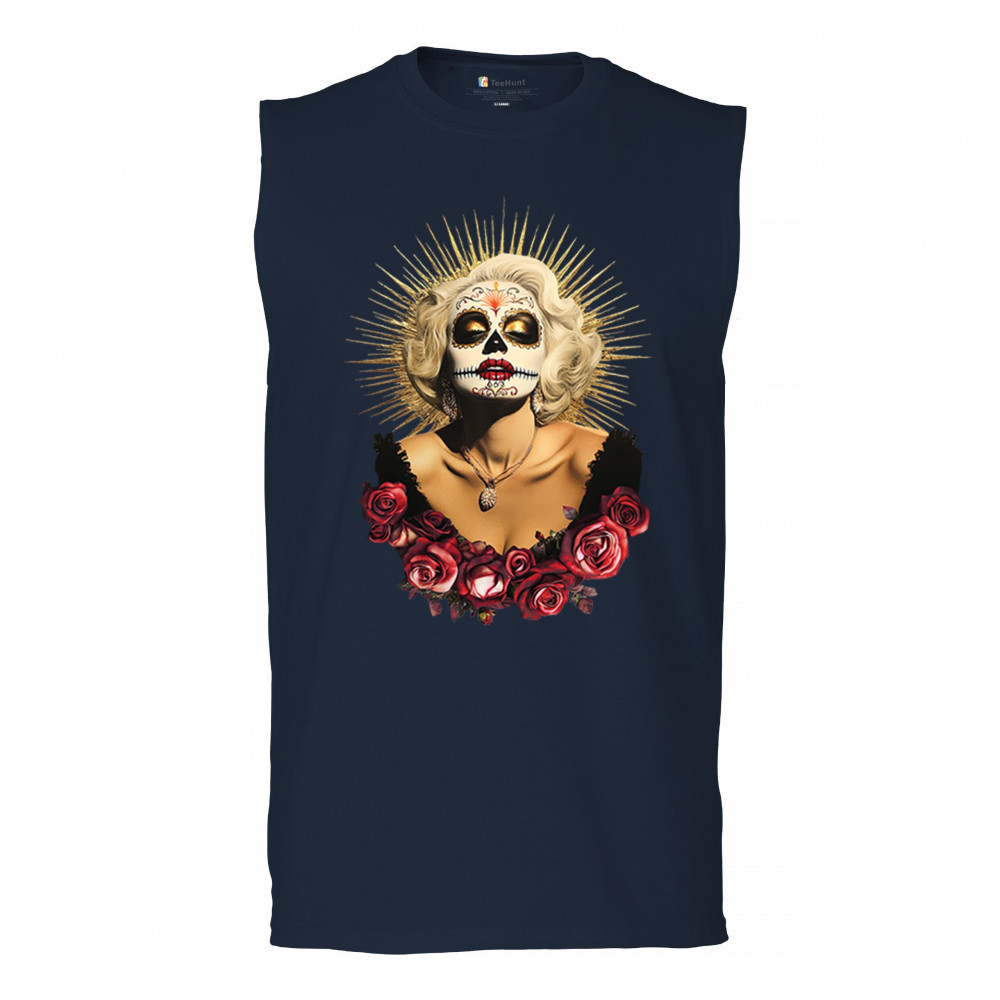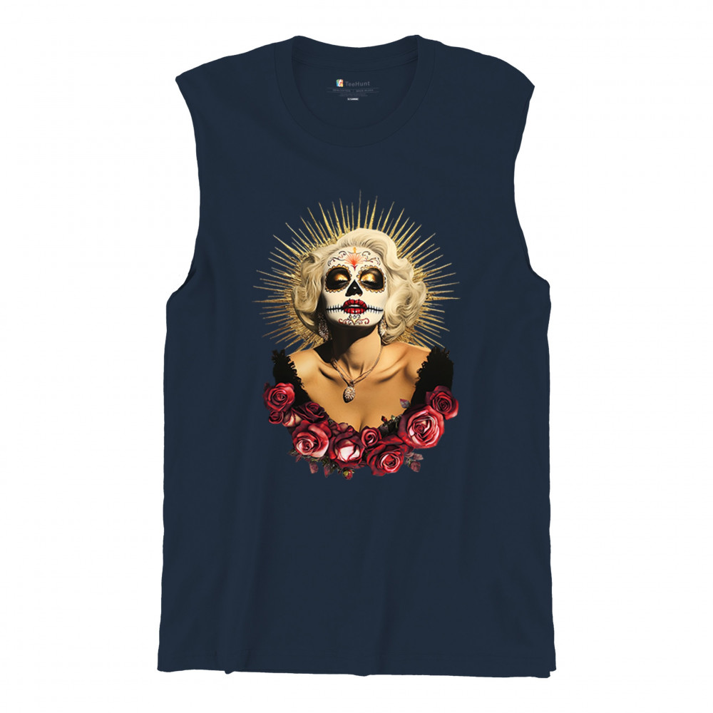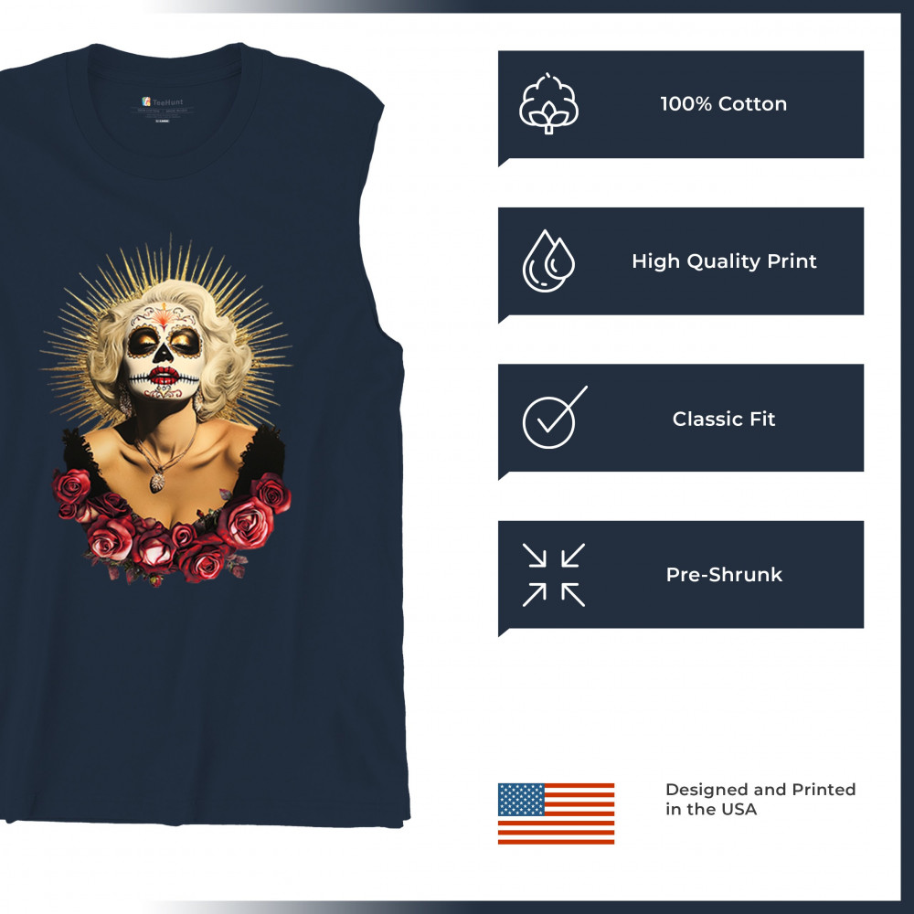 This bold and beautiful sugar skull design features a glamorous calavera woman crowned in a golden halo and framed by roses. A divine tribute to Dia de los Muertos, this look blends vintage glam, Latin culture, makeup artistry, and sacred symbolism. Perfect for fans of gothic beauty, Halloween, and heritage expression.