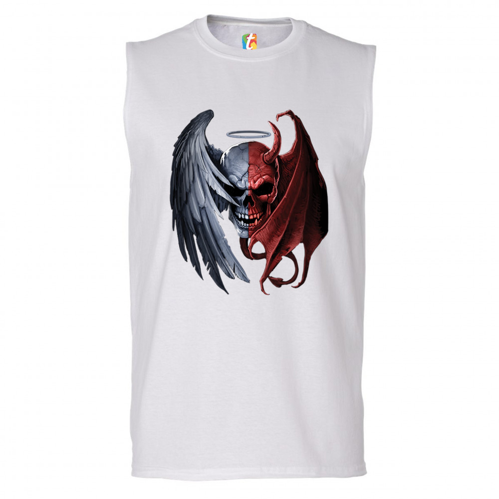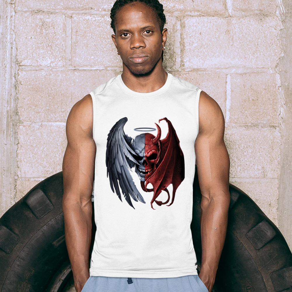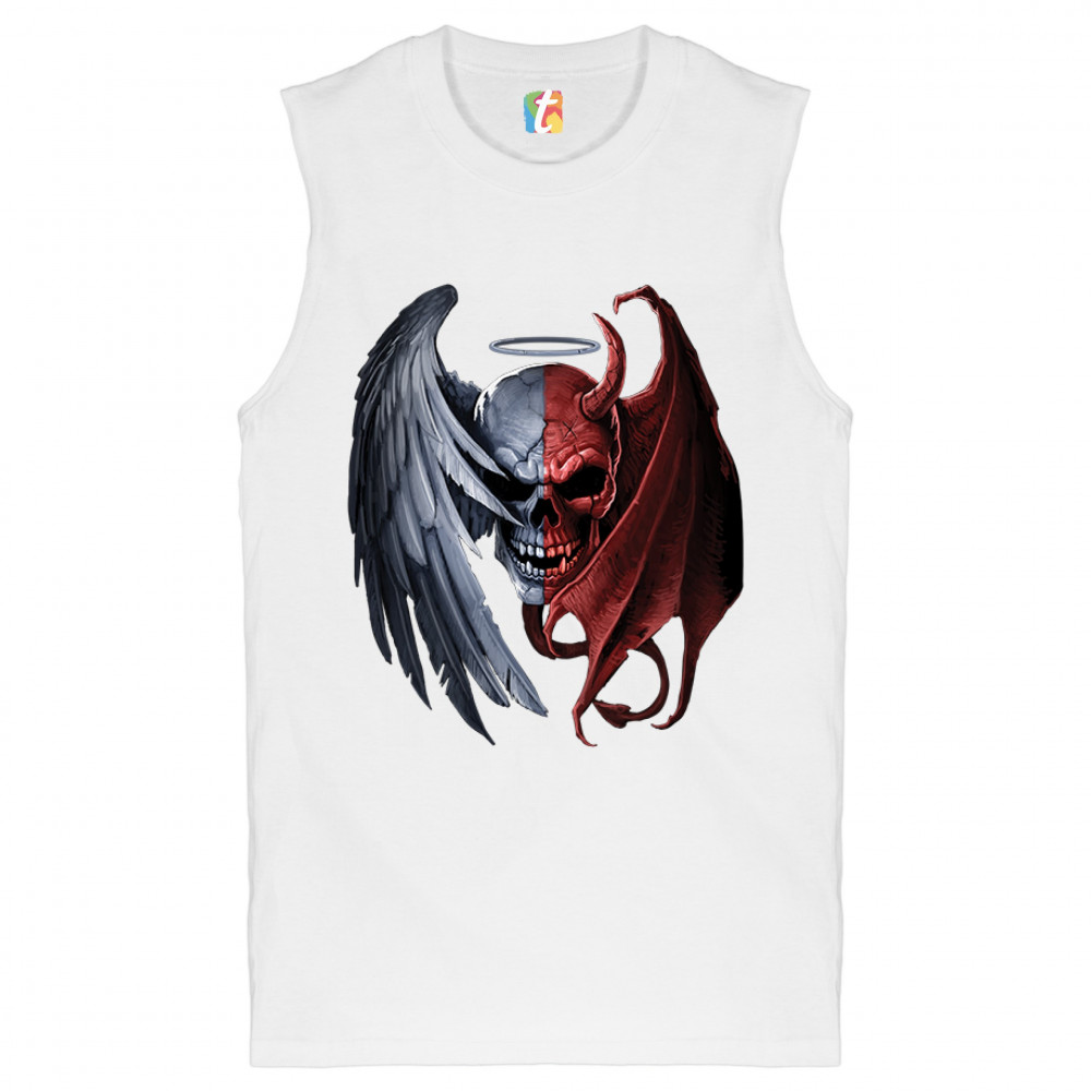 A print featuring a skull face, one half of which is light and has an angel's wing covering it and the other is dark with a horn sticking out of the forehead and a demon's wing. Below the skull you can see a demon's tail and a halo above it. A great