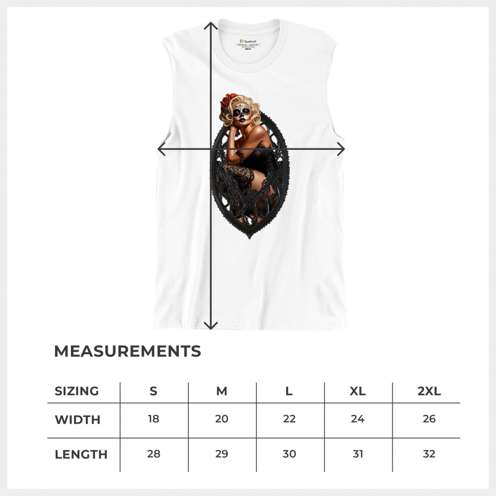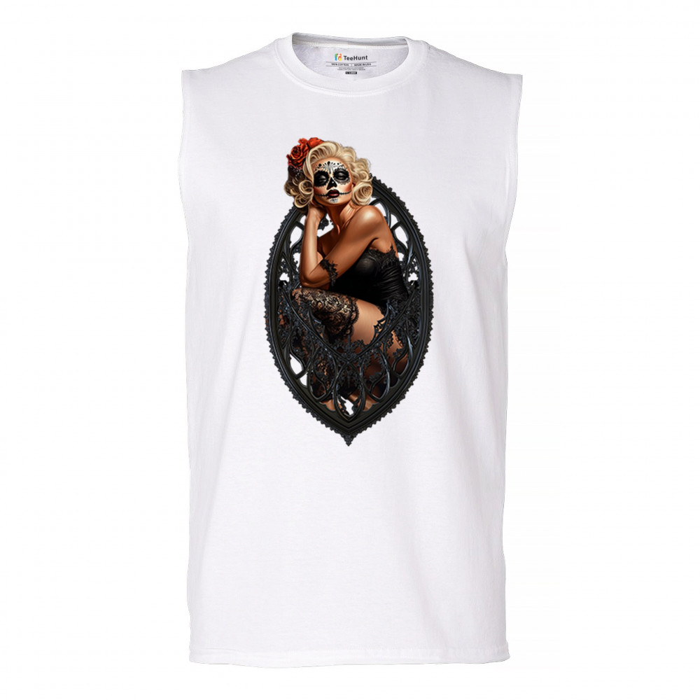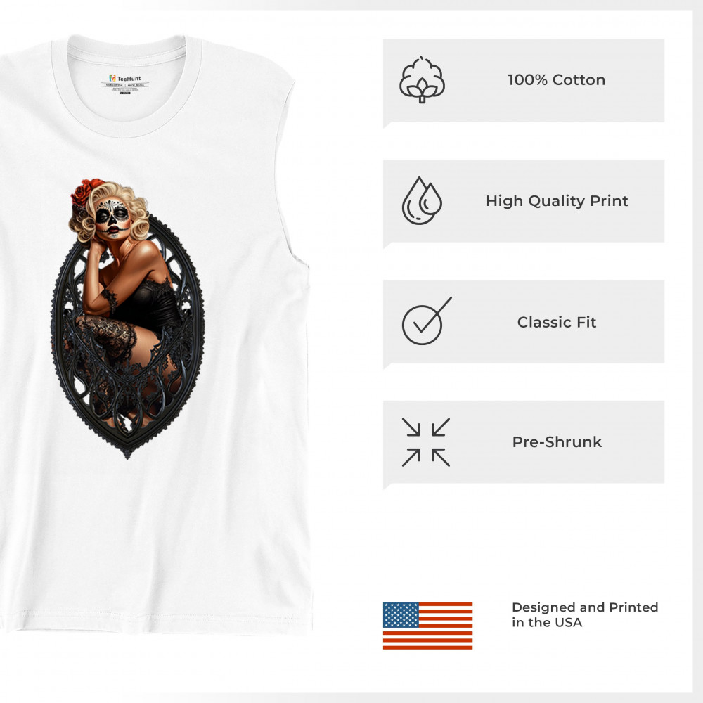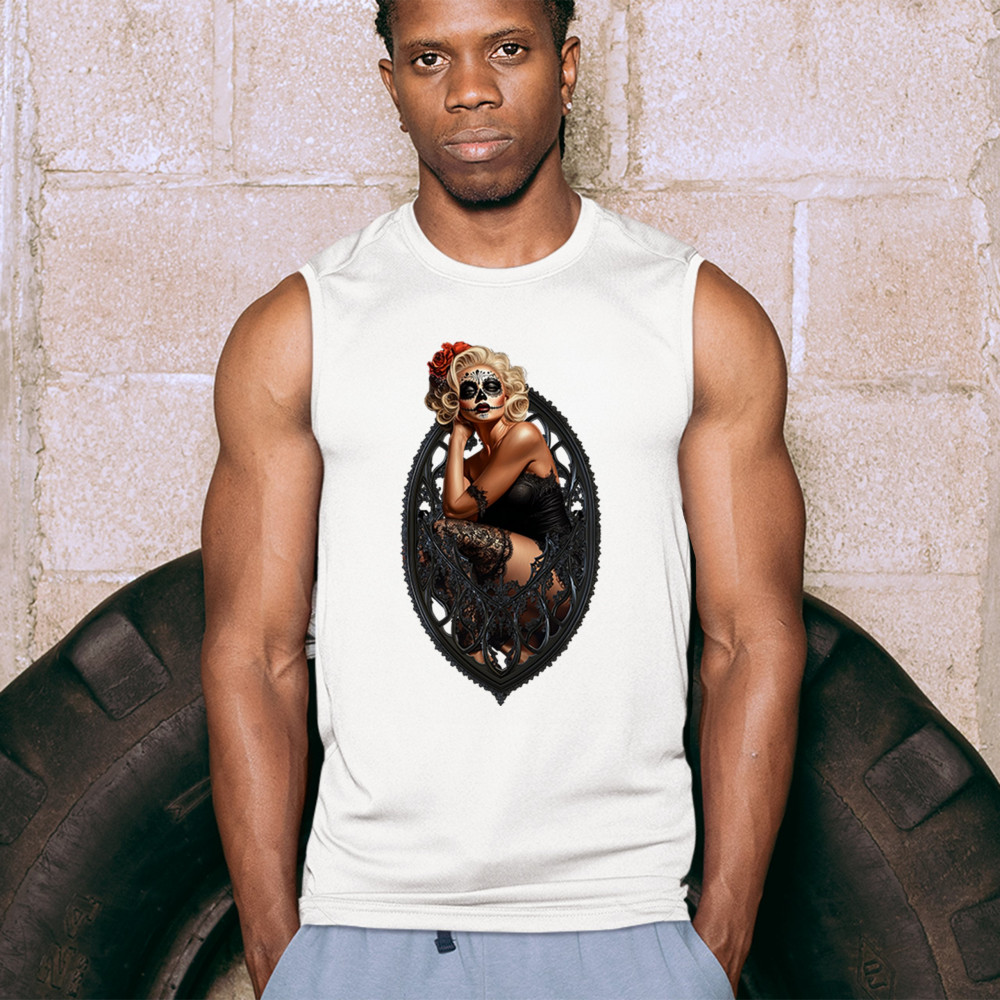 This sultry sugar skull pinup design blends gothic lace, seductive pose, and ornate frame detail for a bold Day of the Dead tribute. With striking makeup and vintage lingerie styling, it’s perfect for fans of macabre fashion, calavera art, and dark romance. A hauntingly beautiful mix of allure, attitude, and Dia de los Muertos charm.