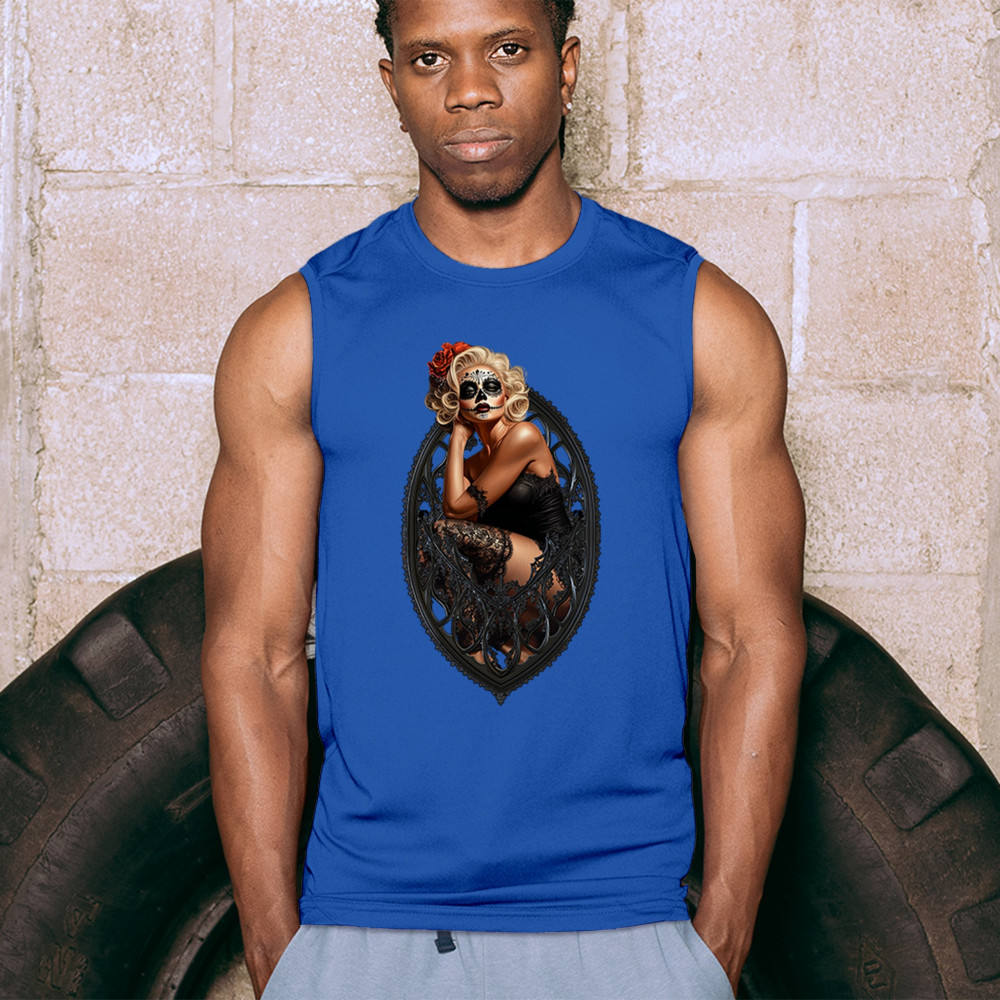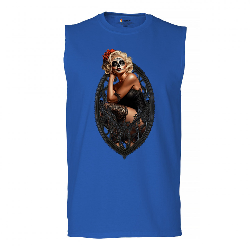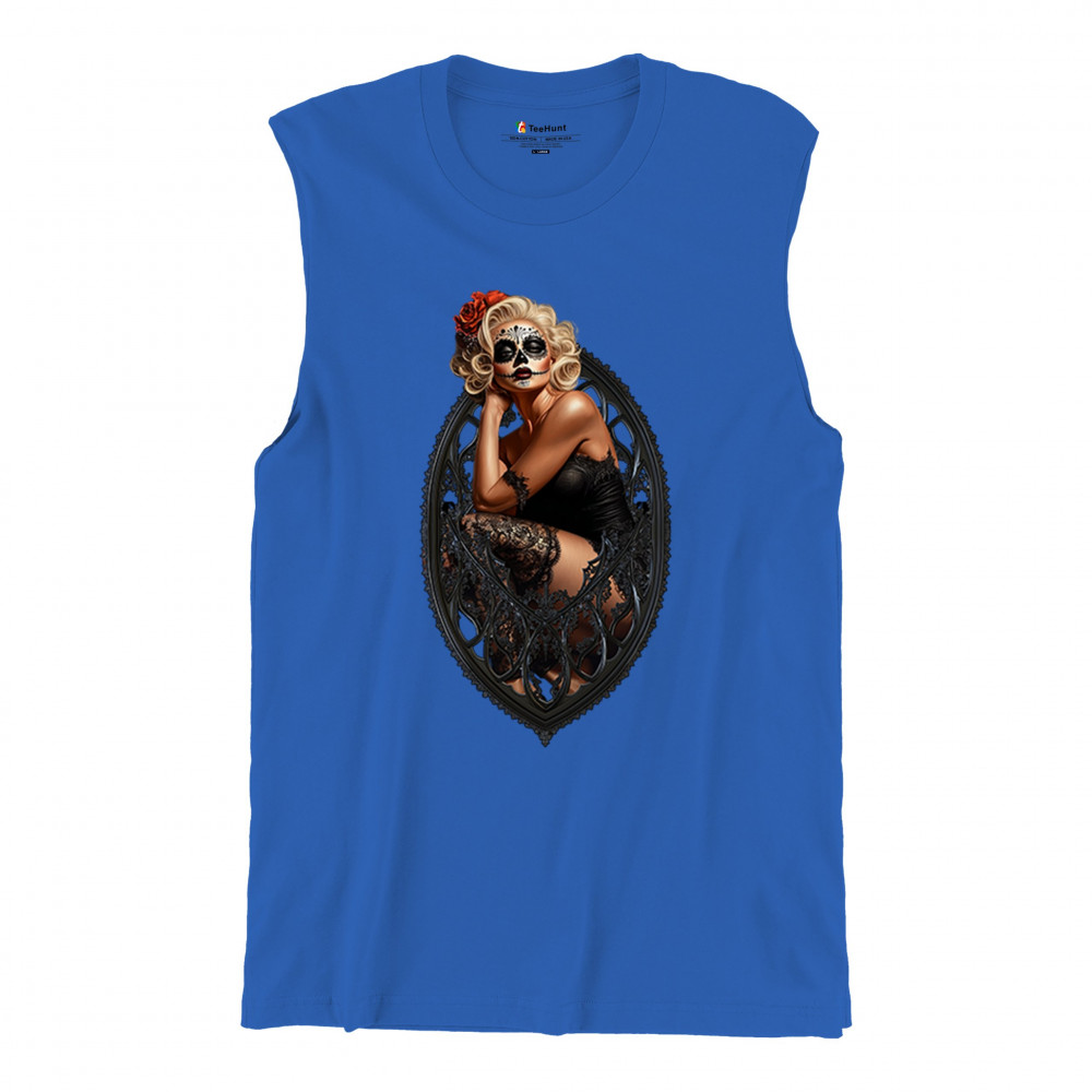 This sultry sugar skull pinup design blends gothic lace, seductive pose, and ornate frame detail for a bold Day of the Dead tribute. With striking makeup and vintage lingerie styling, it’s perfect for fans of macabre fashion, calavera art, and dark romance. A hauntingly beautiful mix of allure, attitude, and Dia de los Muertos charm.