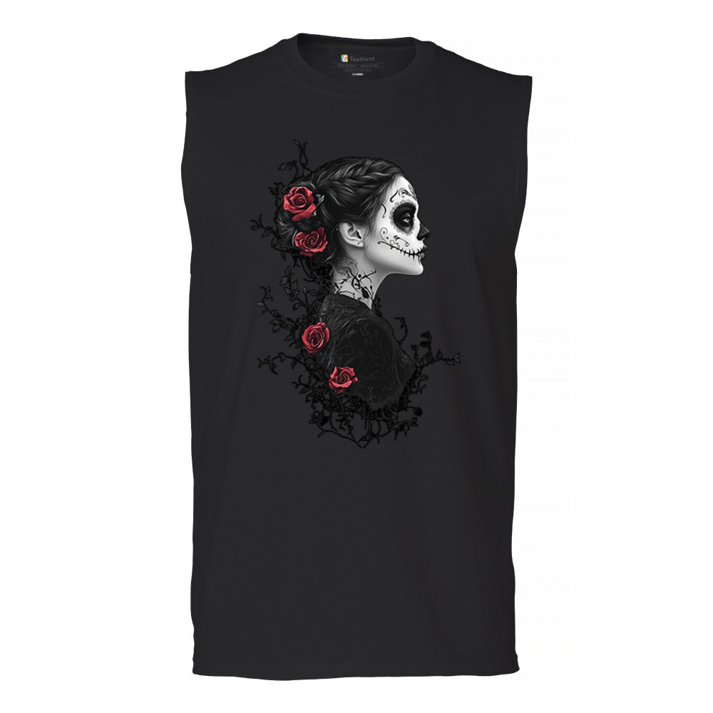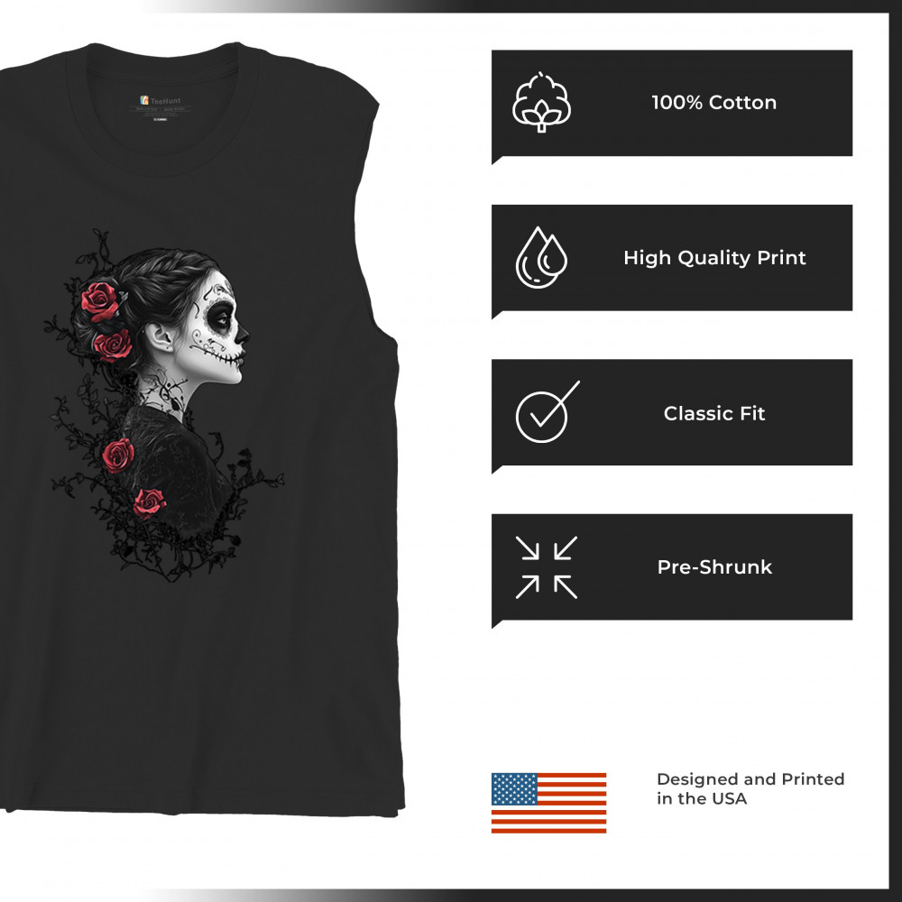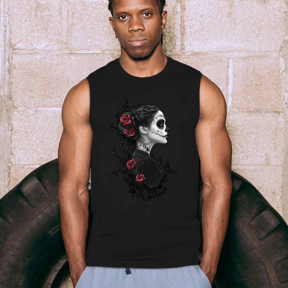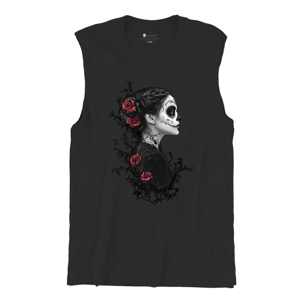 Celebrate Dia de los Muertos in style with this refined sugar skull woman design. Featuring a side profile view, vibrant red roses, and dark gothic floral elements, it creates a graceful balance between mystery and beauty. Ideal for fans of macabre art, skull themes, and honoring ancestral traditions through elegant visuals.