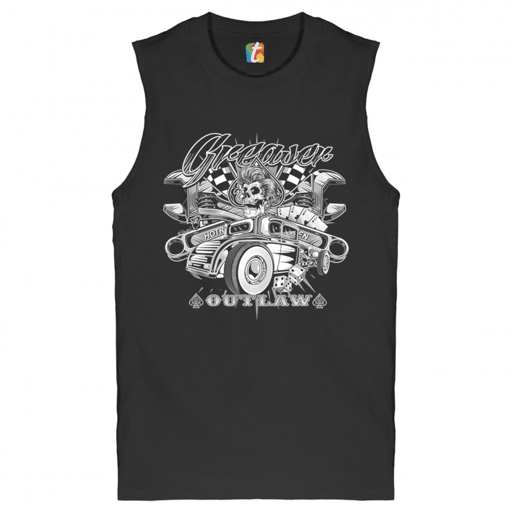 A print featuring a skull, a vintage Hot Rod and a pair of dice. In the background there are crossed wrenches, playing cards and racing flags. The print says: "Greaser outlaw". A great choice for a fan of customized American classic cars and hot rods.