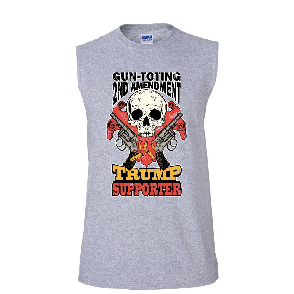 GUN-TOTING 2ND AMENDMENT TRUMP SUPPORTER gun-toting trump supporter muscle shirt 2nd amendment skull revolvers sleeveless gray