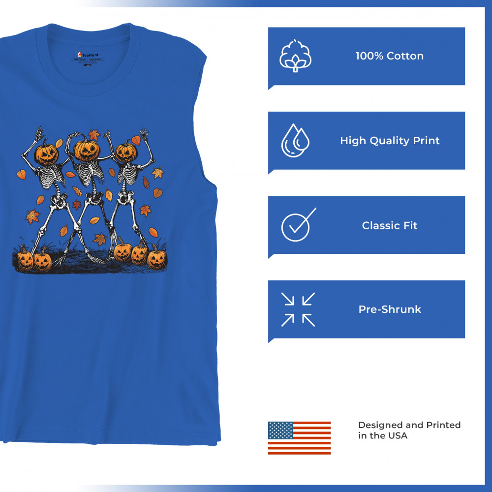 Add a touch of spooky fun to your wardrobe with this lively design featuring pumpkin-headed skeletons dancing through a swirl of autumn leaves. Perfect for Halloween parties, trick-or-treating, and fall festivals, this design is a must-have for anyone who enjoys the whimsical side of the spooky season. Made with comfort and quality in mind, this is the perfect apparel for all your October gatherings and events. Wear it to show off your Halloween spirit!